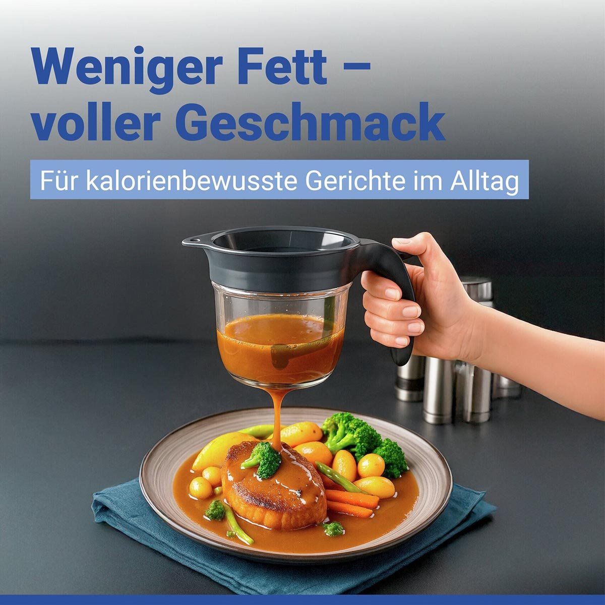 Příprava odlehčených omáček a polévek je s tímto pomocníkem velmi jednoduchá. Stačí nalít vývar nebo šťávu z pečení do nádoby – integrované sítko zachytí pevné části, jako jsou zbytky zeleniny či bylinek. Po krátkém odstání se tuk oddělí na povrchu a pomocí tlačítka v rukojeti snadno uvolníte čistý základ bez přebytečného tuku a bez rozlití.