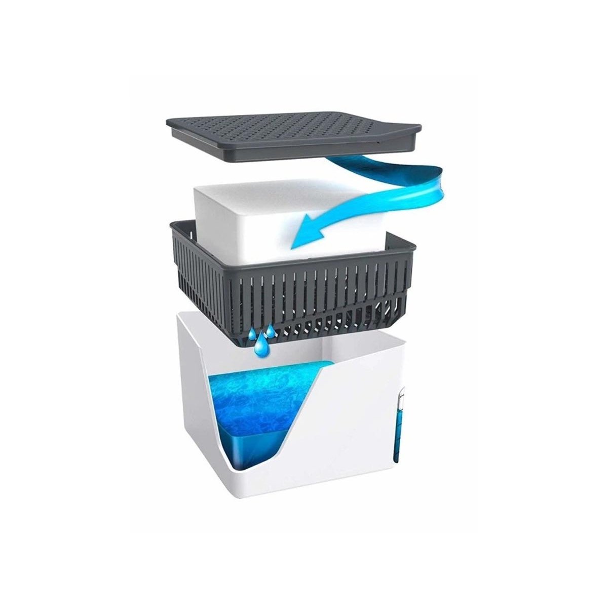 Granulát z chloridu vápenatého účinně absorbuje vlhkost ze vzduchu. Kondenzovaná voda poté stéká do spodní nádržky a díky ukazateli hladiny vody je možné snadno sledovat stav naplnění.