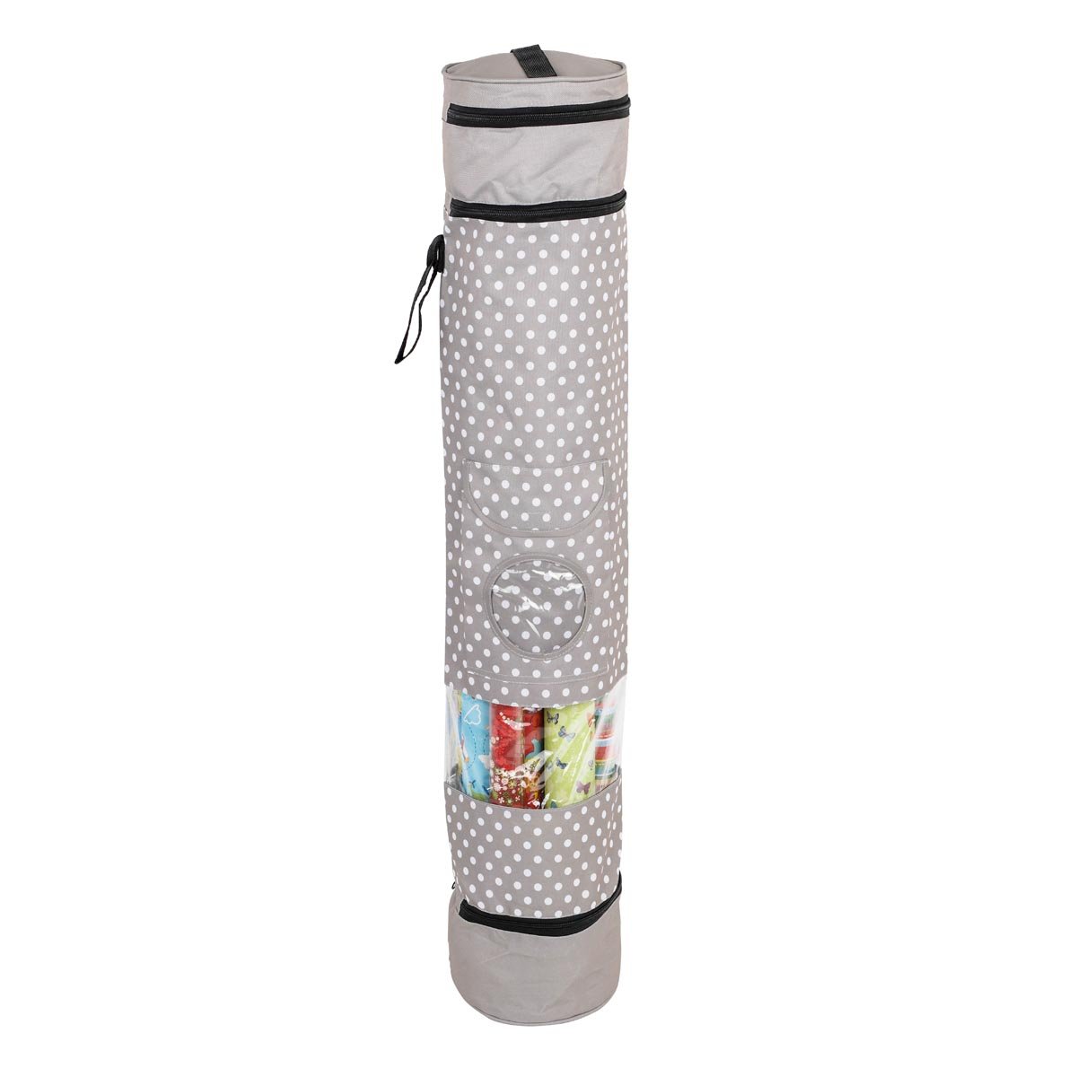 Už nikdy pomačkaný nebo roztrhaný balicí papír! Díky tomuto úložnému organizéru na balící papír můžete své vánoční i dárkové role papíru ukládat přehledně a bezpečně. Organizér je vyroben z odolného PVC/polyesteru a je ideální skladování vánočního i jiného dárkového balícího papíru. Dvě menší boční přihrádky jsou ideální pro balící potřeby jako stuhy, mašle, nůžky, lepicí pásku nebo přáníčka – všechny uzavíratelné zipem nebo suchým zipem. Praktické závěsné poutko umožňuje úsporné a pohodlné skladování.