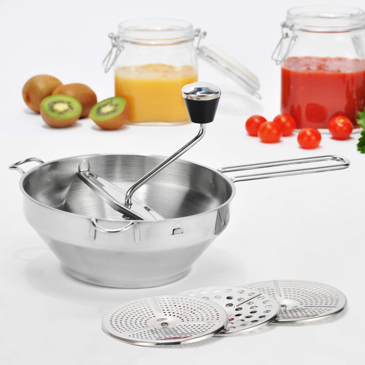 Do spodní části se vloží pevné síto a potraviny se pomocí otáčecí kličky jemně protlačí skrz otvory. Podle druhu potraviny si vyberete vhodný nástavec – s otvory o velikosti 1 mm, 3 mm nebo 7 mm.