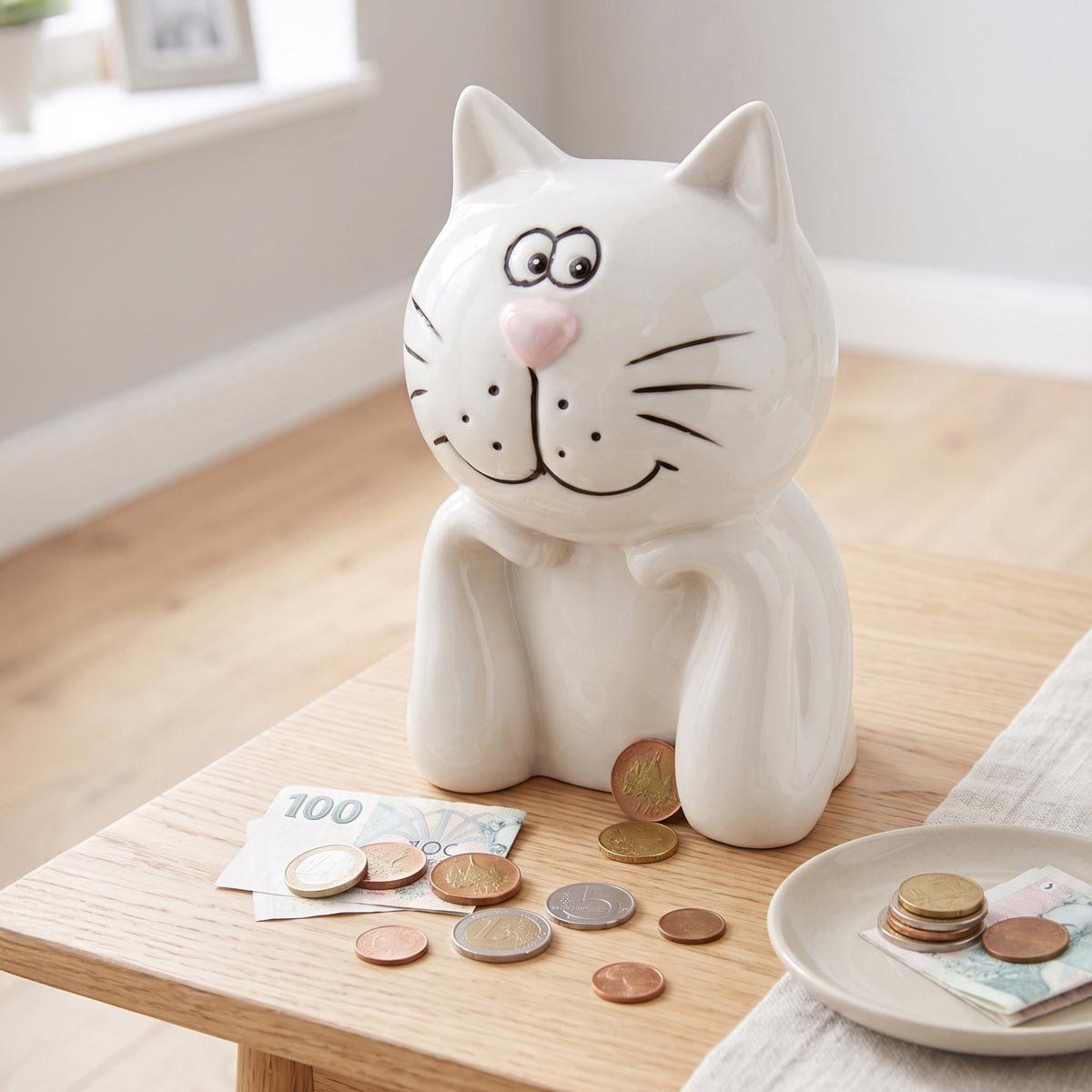 Roztomilá pokladnička na mince v podobě usměvavé kočky je praktickým i dekorativním doplňkem do každého interiéru. Tato kasička z kvalitní keramiky slouží nejen k ukládání úspor, ale také jako stylová dekorativní soška. Hravá soška kočka v lesklém bílém provedení potěší děti i dospělé a skvěle se hodí jako dárek.Doplňkové parametry
