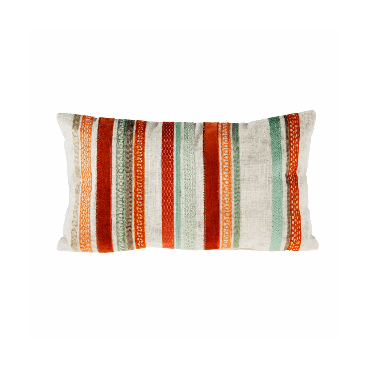 Náročně zpracovaný polštář v „Boho“ stylu, s aplikovanými a vyšívanými pruhy (na lícové straně), včetně vnitřního polštáře, na zip. Lze prát na 30 ° C.