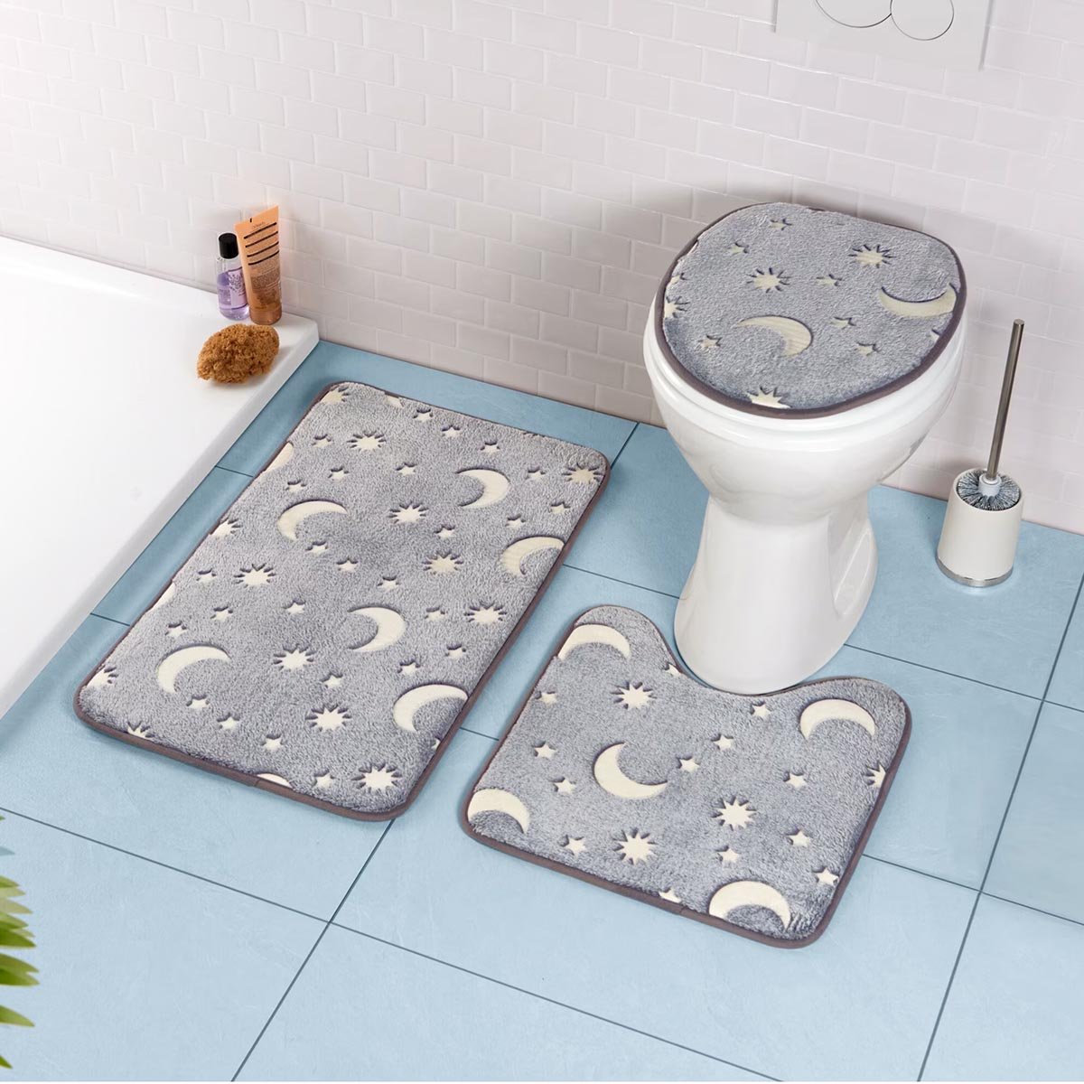 Šedý měkký potah na poklop WC prkénka s vesmírnými motivy je pěkným prvkem na toaletu.