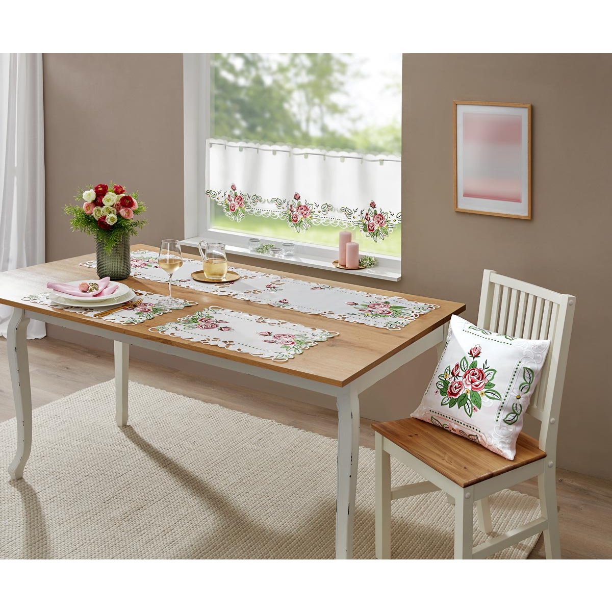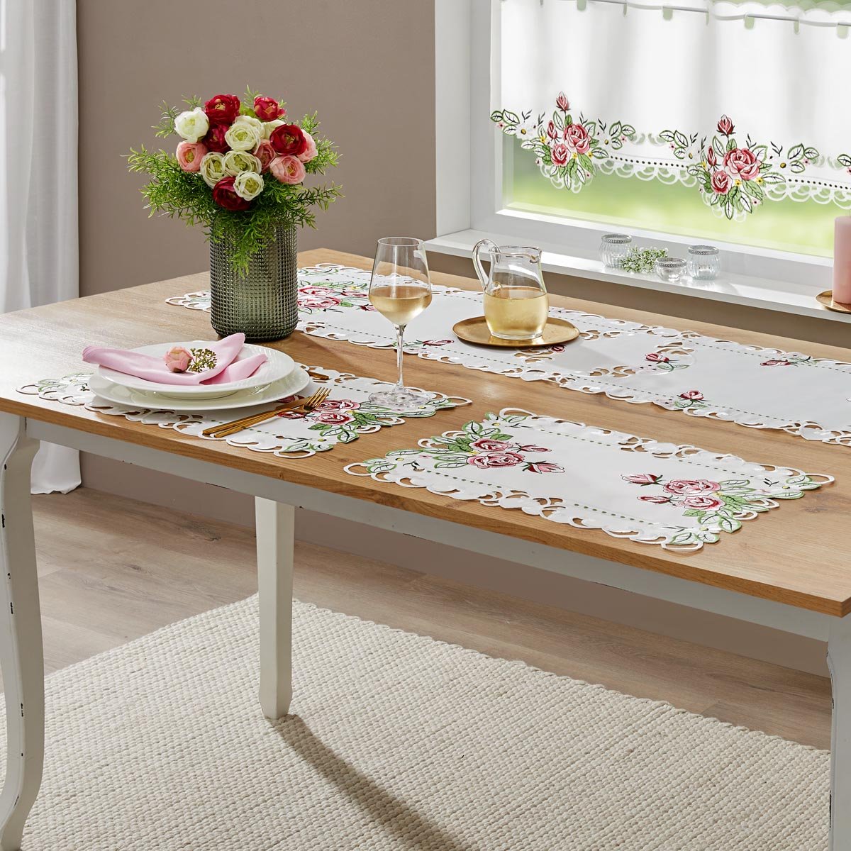 Dodejte svému jídelnímu stolu nádech romantiky s tímto elegantním prostíráním na stůl. Jemná růžová výšivka vytváří krásný dekorativní prvek, který ozvláštní každé stolování – ať už při snídani, obědě nebo večeři.
