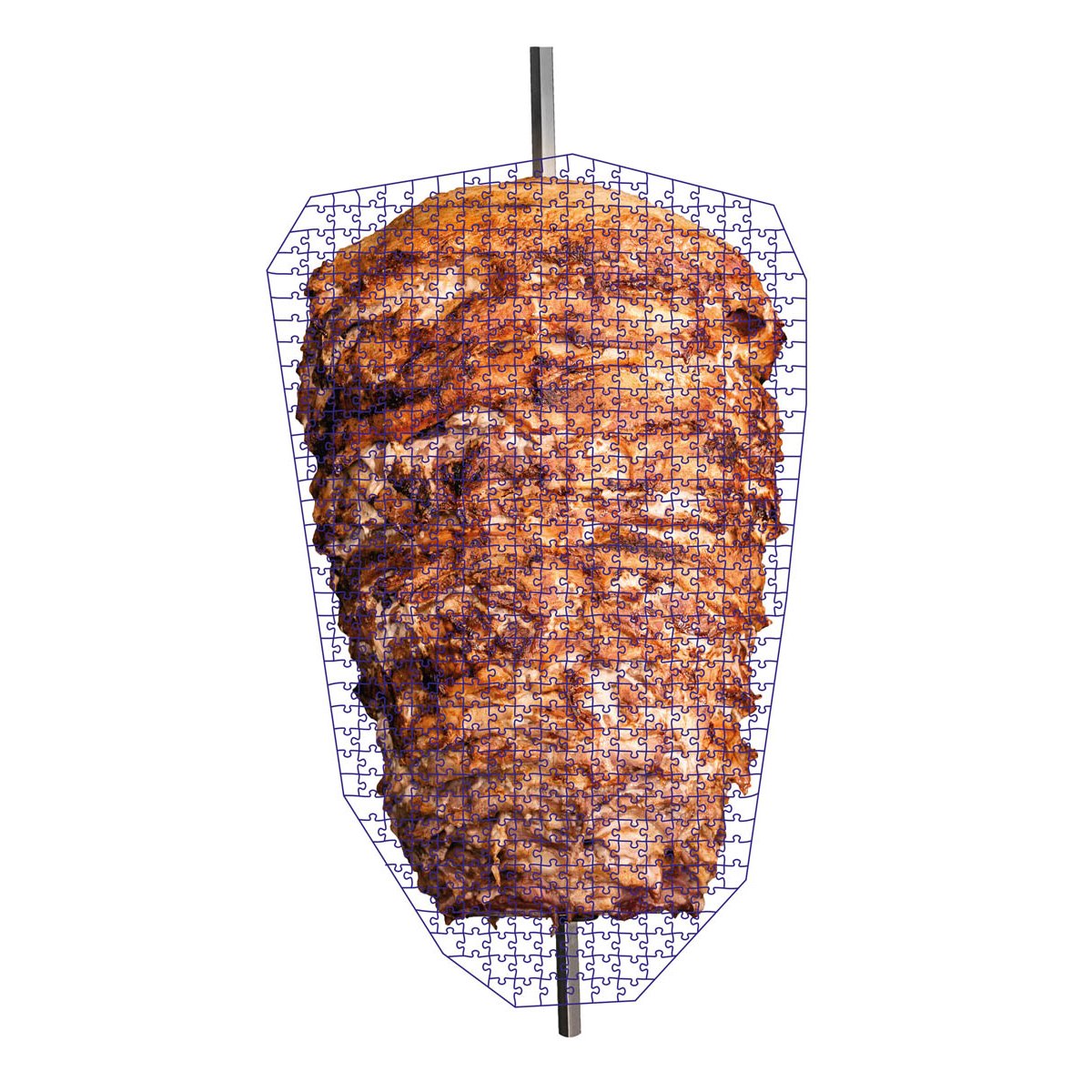 Puzzle v podobě opékajícího se kebabu. Dílky jsou uloženy v krabičce jako čerstvě nařezaný kebab.