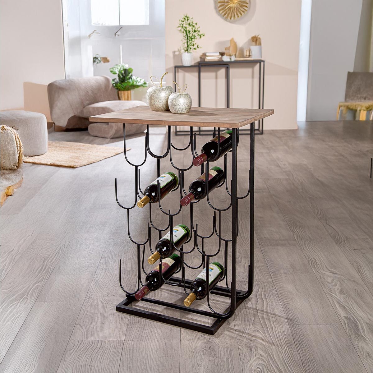 Designový regál na víno z kovu s horní deskou v dekoru dřeva je praktickým i stylovým doplňkem do moderního i industriálního interiéru. Nabízí kapacitu až pro 18 lahví, které jsou uloženy bezpečně a přehledně v pevném kovovém rámu. Horní deska slouží jako odkládací plocha pro dekorace, sklenice nebo doplňky k servírování. Stabilní konstrukce zajišťuje dlouhou životnost držáku na víno a bezpečné používání. Díky rozměrům 38 × 60 × 87 cm se stojan na víno hodí do kuchyně, obývacího pokoje, jídelny, i domácí vinotéky. Ideální řešení pro milovníky vína, kteří chtějí mít svou sbírku elegantně uspořádanou a vždy po ruce.