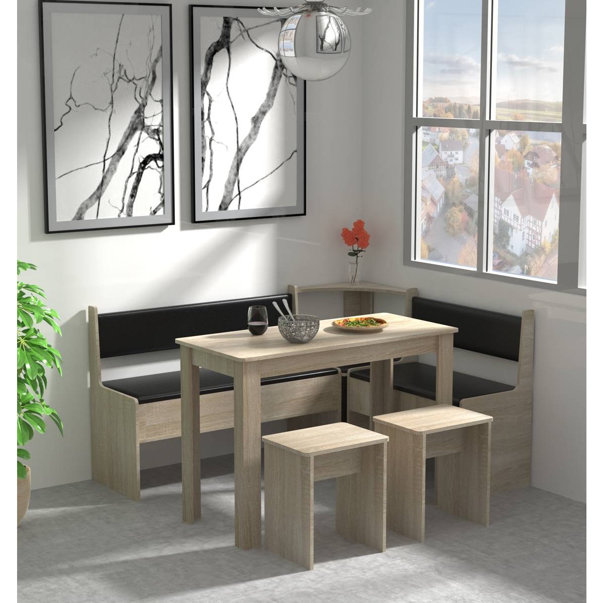 Dvě lavice s úložným prostorem a kompaktní stůl zajišťují maximální využití prostoru bez kompromisů na pohodlí. Díky variabilní montáži lze sestavu přizpůsobit libovolně do levého nebo pravého rohu.