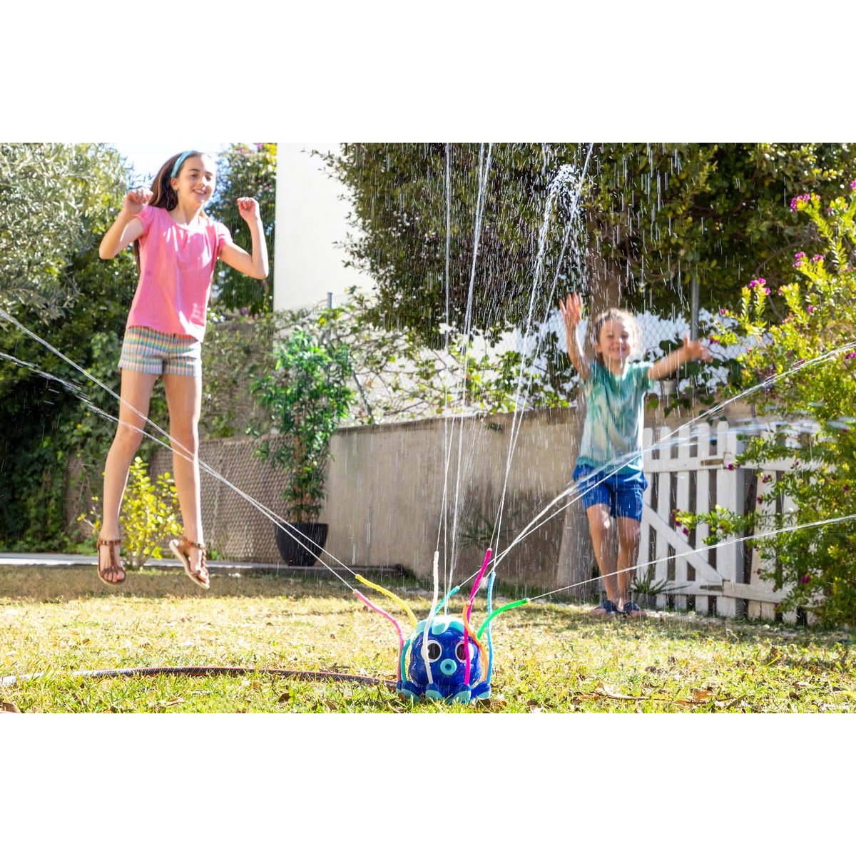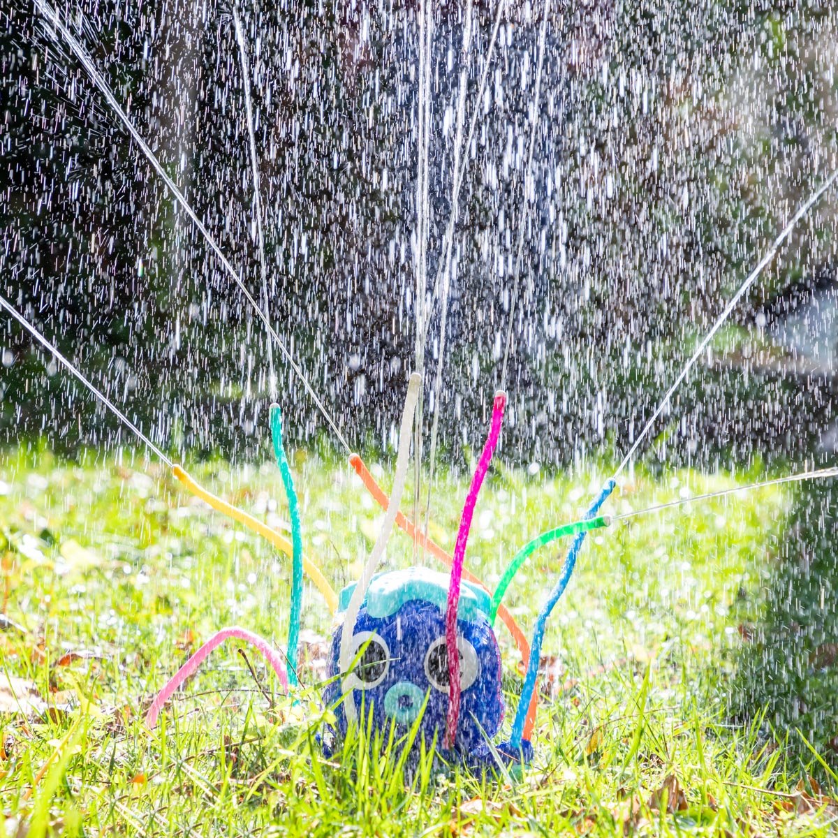 Hračka s 360° vodním postřikovačem, která se připojuje přímo k zahradní hadici (nebo pomocí přiloženého adaptéru) a stříká vodu skrze svá barevná chapadla, abyste si mohli hrát a užívat si venku.