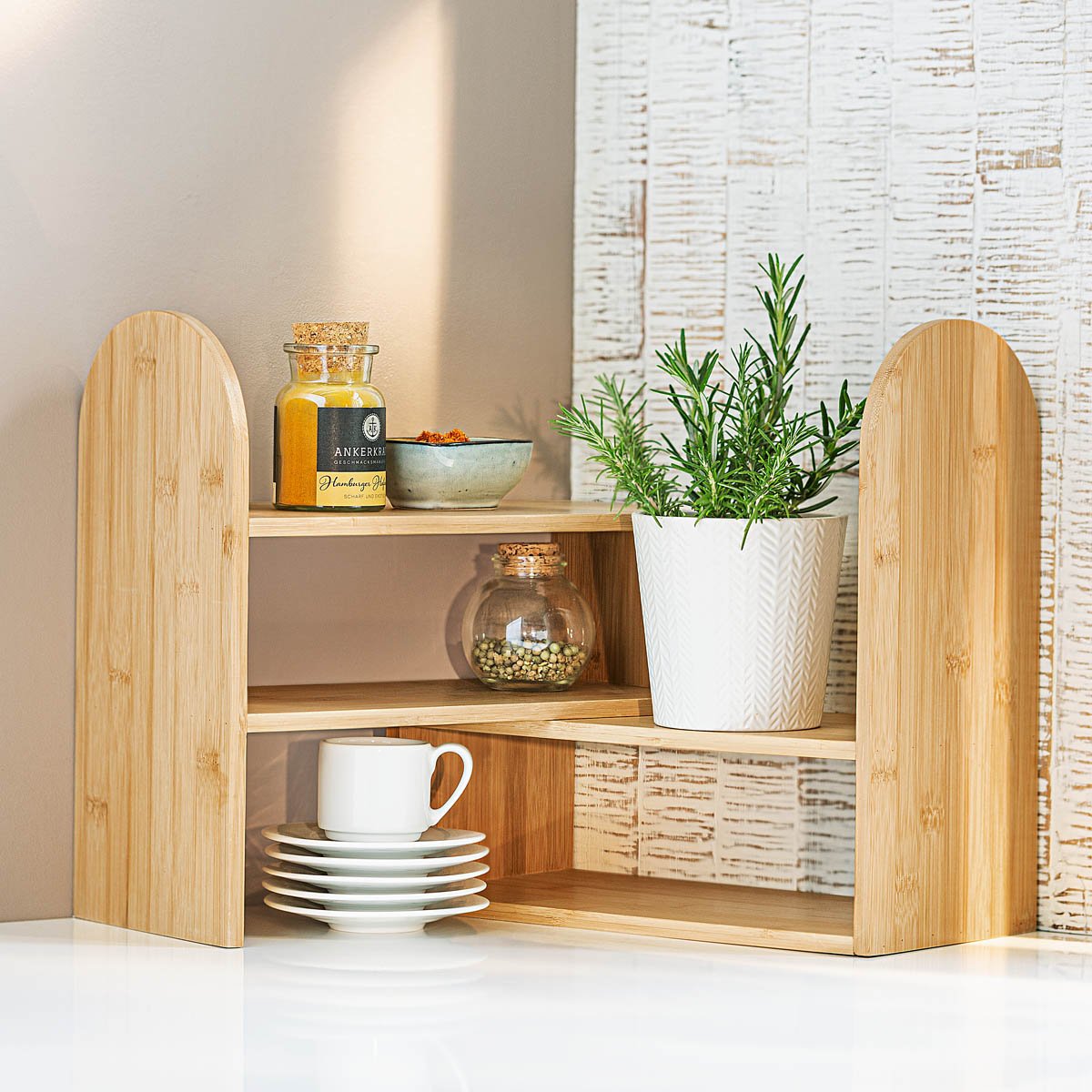 Police je ideální pro mnoho věcí, které byste rádi měli v kuchyni po ruce: Koření, šálky, čaj a káva, cukr a sůl, ocet a olej, snídaňové cereálie nebo dokonce hrnec s čerstvými bylinkami...