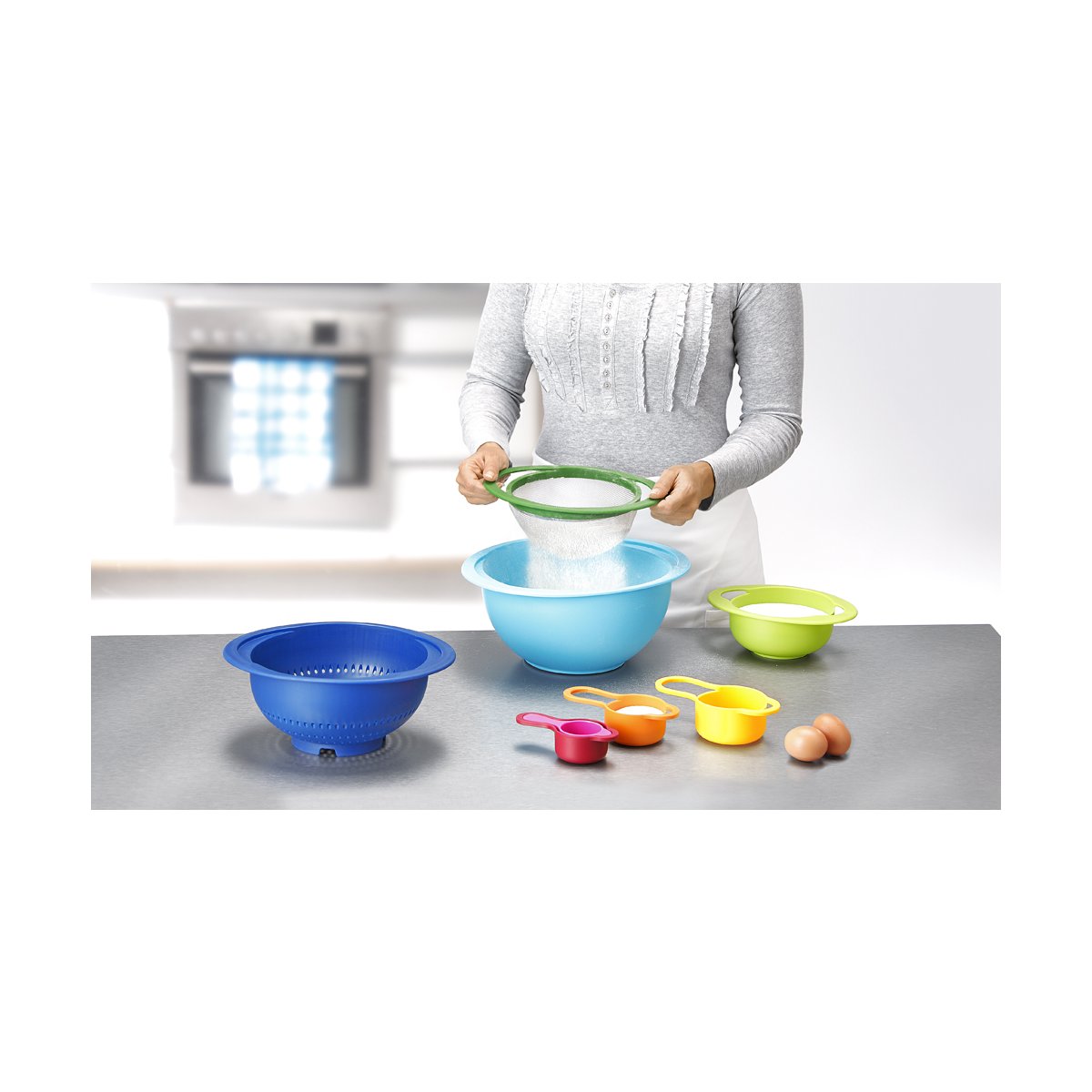 8-dílná sada obsahuje: 2 míchací mísy 5 l a 500 ml, 1 sítko ( ? 19 cm), 1 cedník ( ? 23 cm), 4 odměrky (60/85/140/220 ml) .