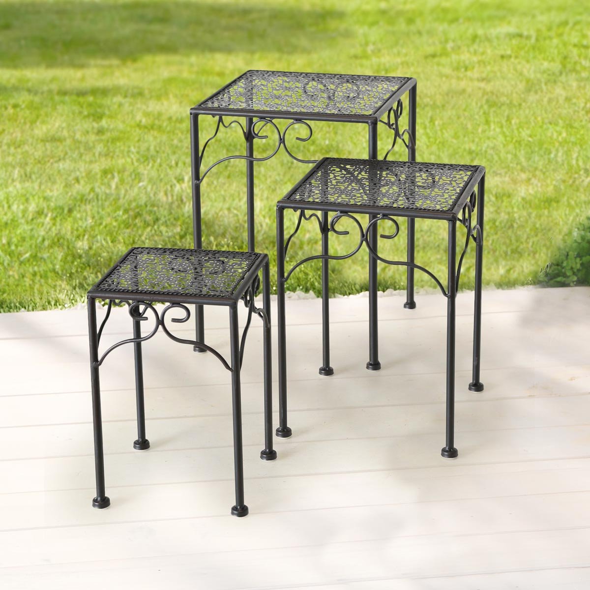 Tato sada odkládacích stolků s ornamentální zdobenou horní deskou je vyrobena z lakovaného kovu. Stolky se hodí jak do venkovského, tak i do moderního interiéru.