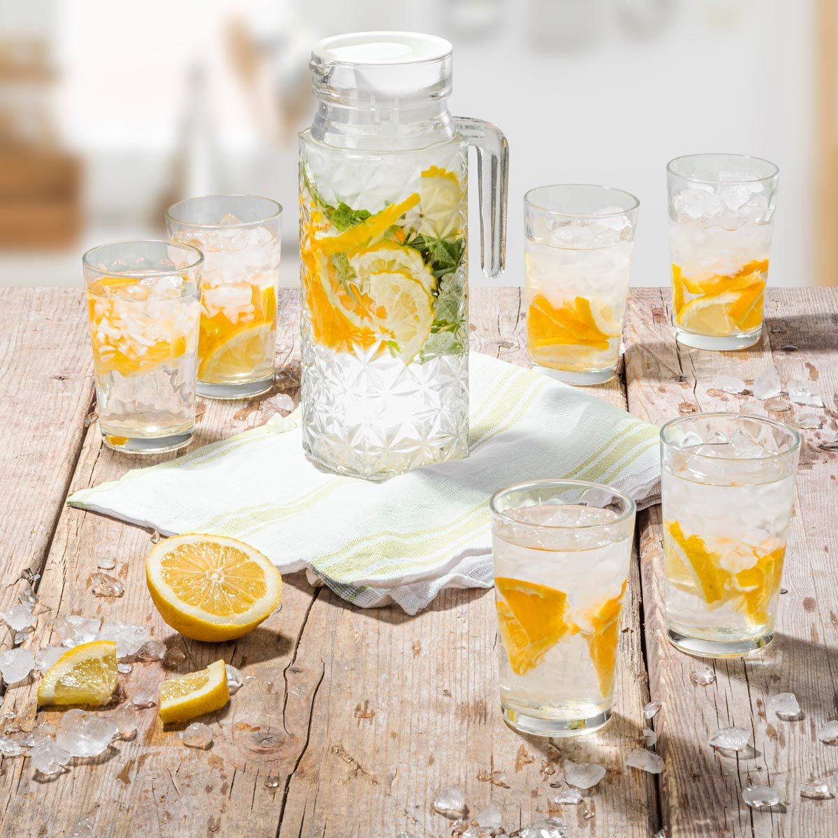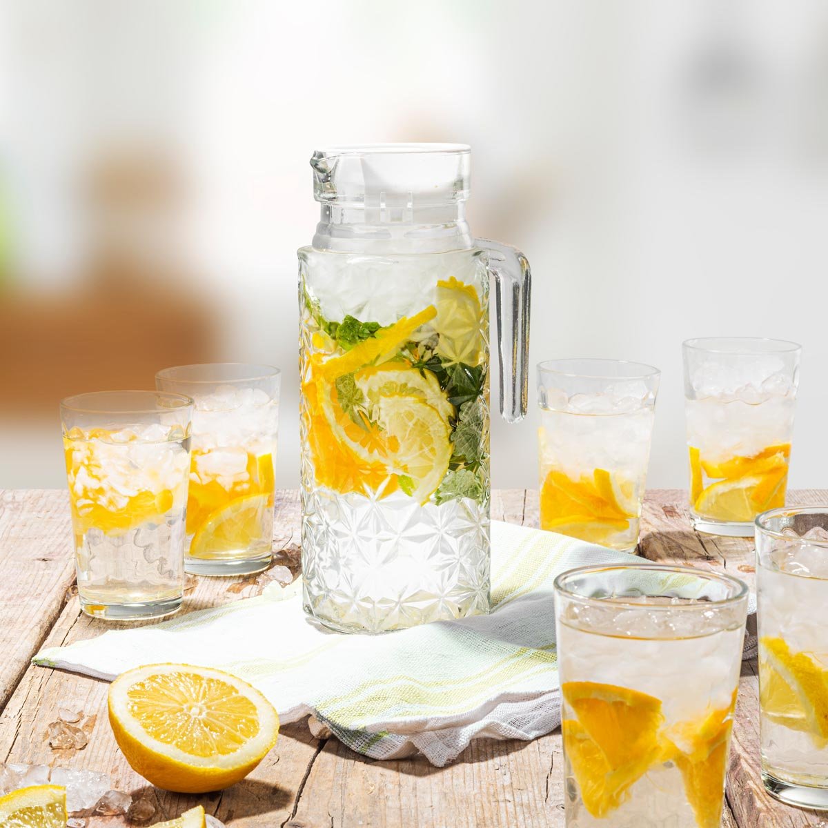 Strukturované sklo vypadá velmi atraktivně a luxusní objem karafy zajišťuje dostatek prostoru na osvěžující nápoje pro všechny hosty. Se 6 sklenicemi získáte kompletní sadu pro podávání nápojů během společenských událostí nebo každodenních chvilek s rodinou. Posuňte díky ní přípravu nápojů na zcela novou úroveň.
