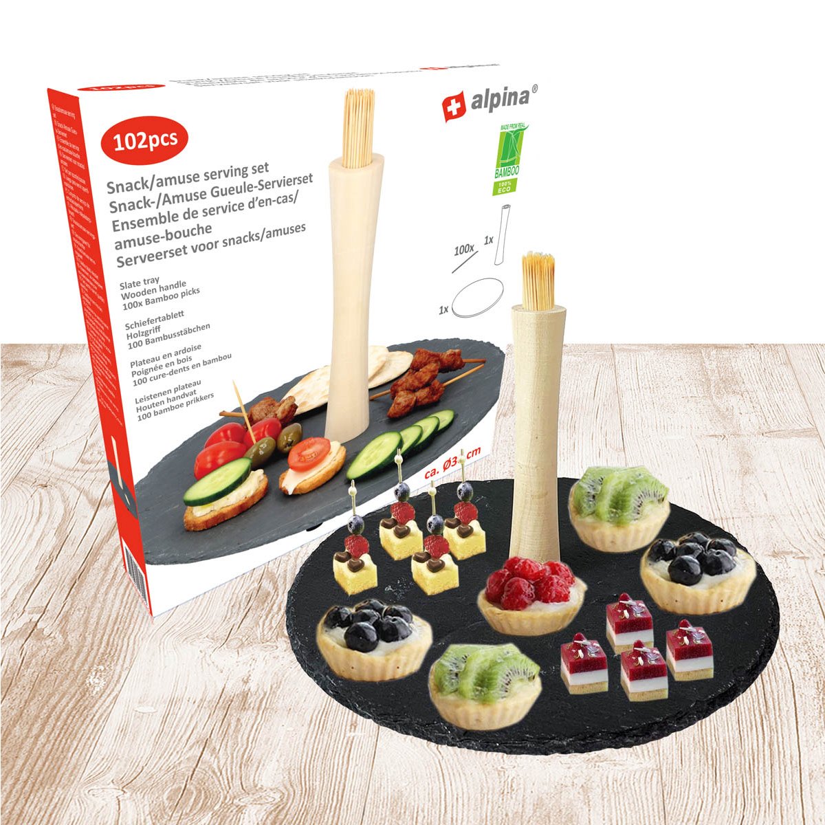 Olivy, plněná cherry rajčata, kuřecí špízy, toasty... Tento krásný servírovací tác z břidlice s dřevěnou rukojetí udělá i z bloku sýra talíř hodný michelinské hvězdy. Dřevěná rukojeť má prostor pro koktejlové tyčinky. Díky svému modernímu designu se hodí do každého interiéru.Průměr servírovacího podnosu je 30x30 cm a výška 17 cm. Obdržíte s ním přibližně 100 bambusových koktejlových tyčinek.