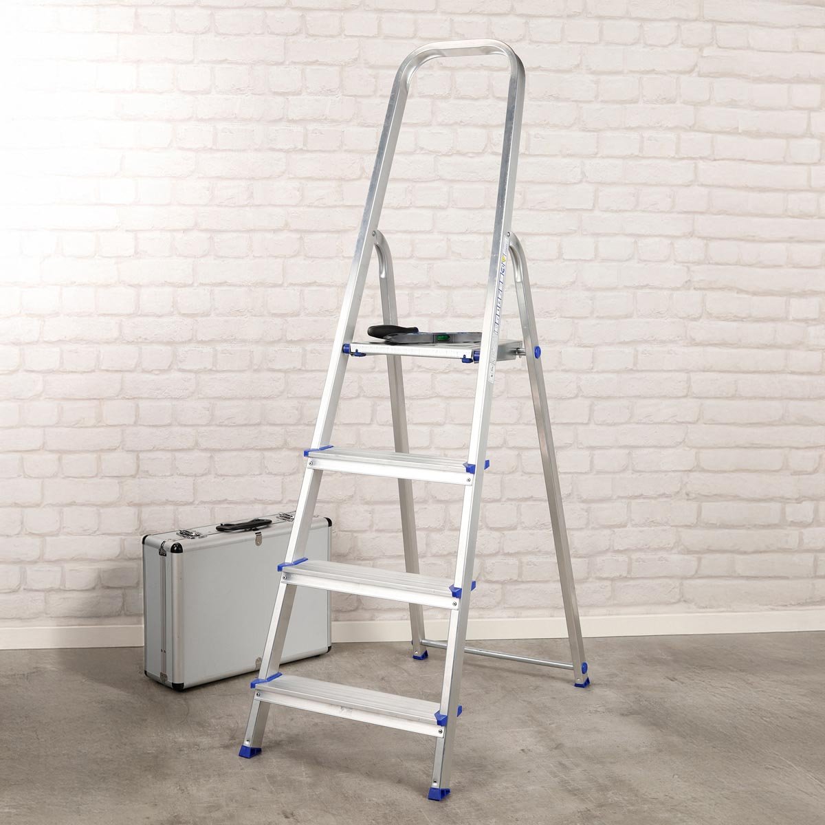 Lehké a praktické čtyřstupňové schůdky jsou ideálním pomocníkem do domácnosti. Díky pevné hliníkové konstrukci jsou stabilní, odolný a zároveň snadno přenosné. Protiskluzové nášlapy a nožky zajišťují bezpečné používání, ať už při úklidu, malování nebo práci ve výškách.