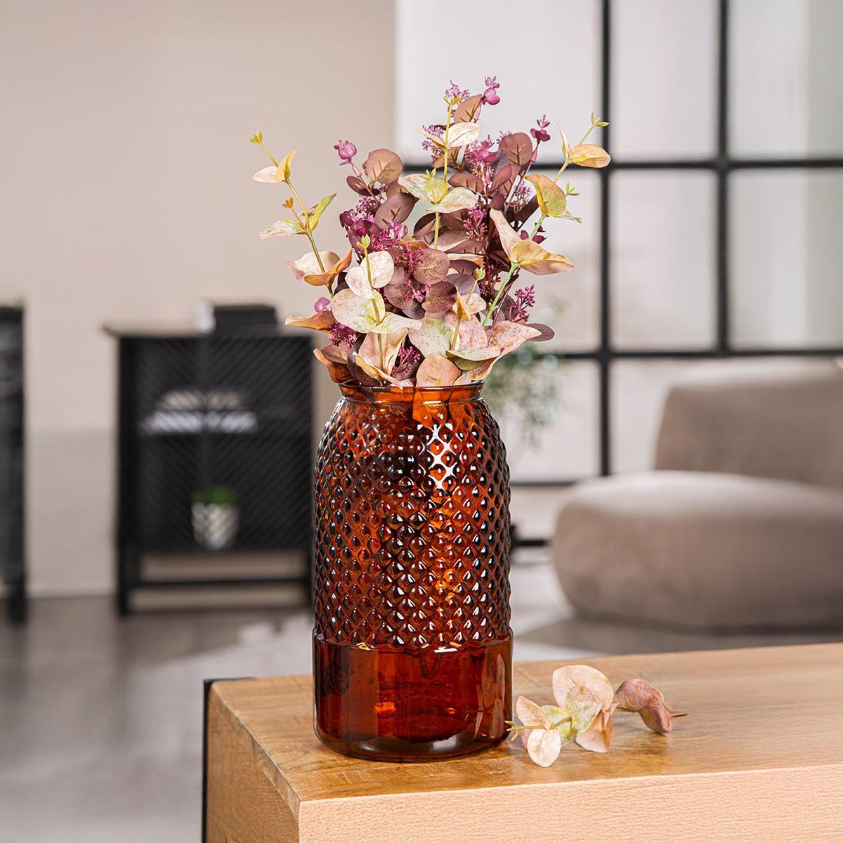 Elegantní skleněná váza Diamond v hřejivém hnědém tónu je stylovým doplňkem každého interiéru. Díky unikátní diamantové struktuře povrchu, která krásně odráží světlo, působí jako umělecký dekorativní prvek. Vysoká váza je vhodná jak pro výrazné aranžmá, tak samostatně jako designový kus.