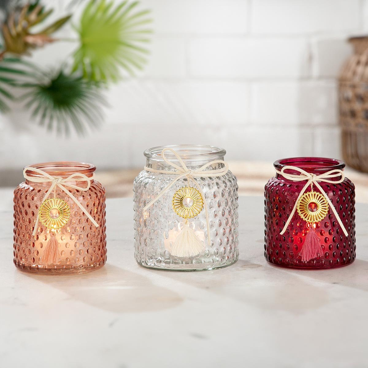 Skleněné svícny Ornato jsou elegantním dekoračním prvkem na stůl, poličku či parapet. Tři různá barevná provedení – bílé, jemně růžové a bordó – vytvářejí po zapálení svíčky nádherné odrazy na okolních stěnách. Každý svícen navíc zdobí kožený provázek s pěkným slunečním přívěskem ve zlaté barvě.