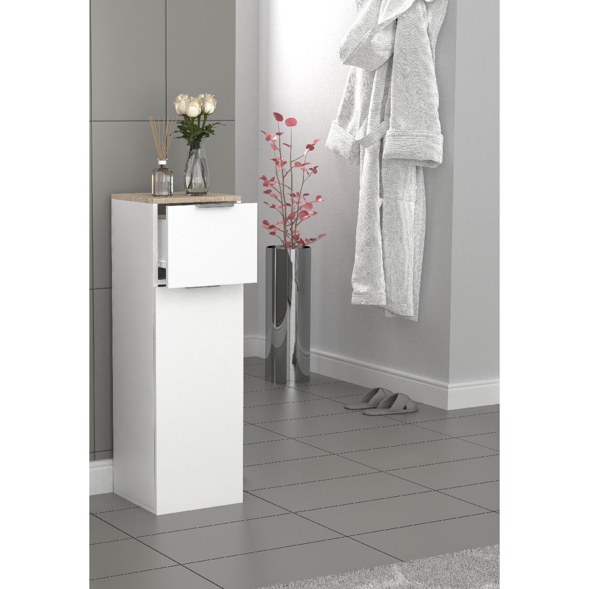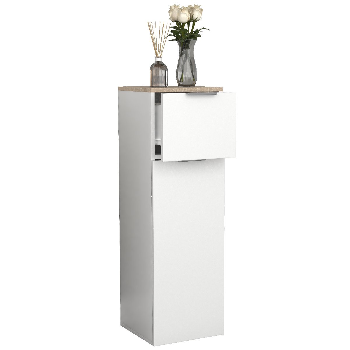 Hlavní vlastnosti: - Rozměry cca v. 95 x š. 30 x h. 30 cm - Jedna zásuvka pro uzavřený úložný prostor - Jedna velká dvířka na pantech se dvěma přihrádkami za nimi Skříňka midi VCM „Donali“ se perfektně hodí do každé koupelny, a proto designér záměrně zvolil nadčasová dvířka a zásuvku na pantech. Povrch s melaminovým povlakem usnadňuje čištění skříňky a je odolná vůči vlhkosti. Skříňku midi lze doplnit dalším koupelnovým nábytkem ze „série Donali“. Od 70. let 20. století se VCM specializuje na návrh, výrobu a distribuci nábytku s férovým poměrem cena/výkon a již zkrášlila miliony domácností.Doplňkové parametry