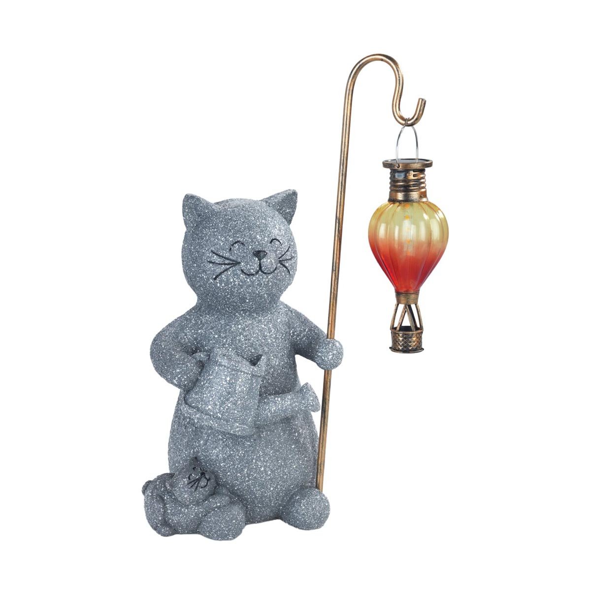 Tato originální zahradní soška ve tvaru kočky s horkovzdušným balónem je krásnou dekorací na zahradu, která vytvoří příjemnou atmosféru během večerního posezení. LED světlo uvnitř balónu vydává teplé, jemně blikající světlo a funguje jako stylová LED dekorace pro venkovní prostory.