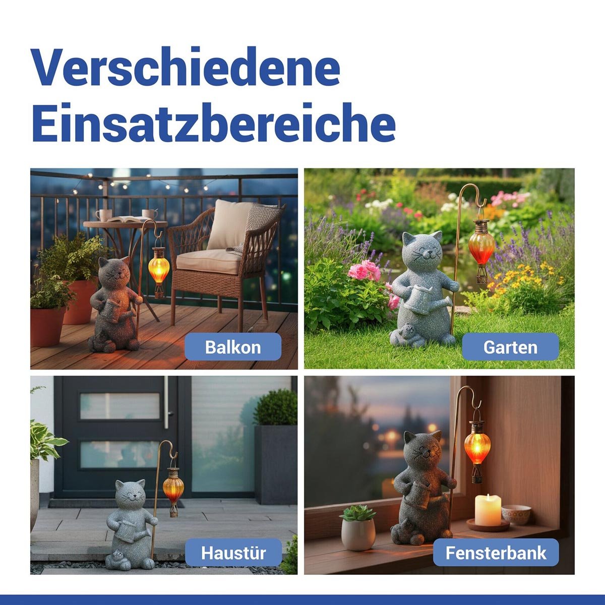 Tato hravá dekorace kočka se hodí do záhonů, podél zahradních cest, na terasu i balkon. Vytváří jemný světelný akcent a dodává exteriéru osobitý a útulný vzhled.