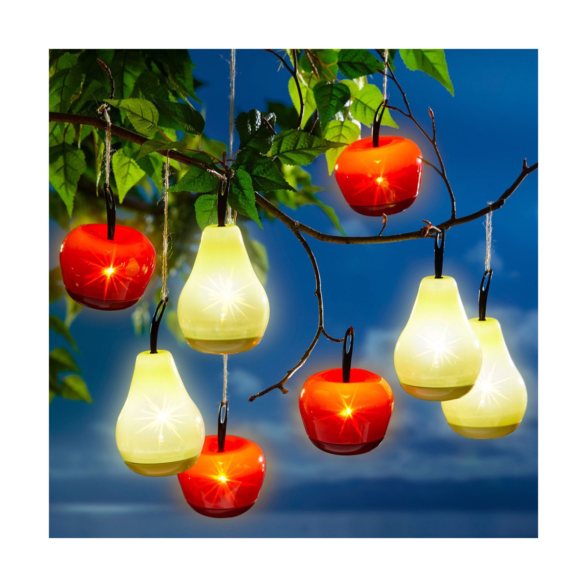 Naše solární ovoce bude nádhernou letní výzdobou vaší zahrady. Stopka ovoce poslouží jako háček. Zespodu plodů najdete spínač.
