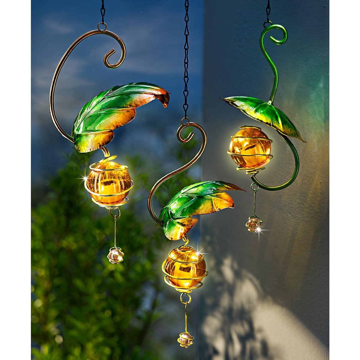 Stačí zavěsit tři kovové listy venku a počkat na večer – po setmění začnou reliéfní koule atmosféricky zářit. Ve dne i v noci vypadá tato závěsná dekorace krásně, ať už jednotlivě, nebo jako trojice. Můžete ji použít ve vstupním prostoru, na balkoně nebo na zahradě.
