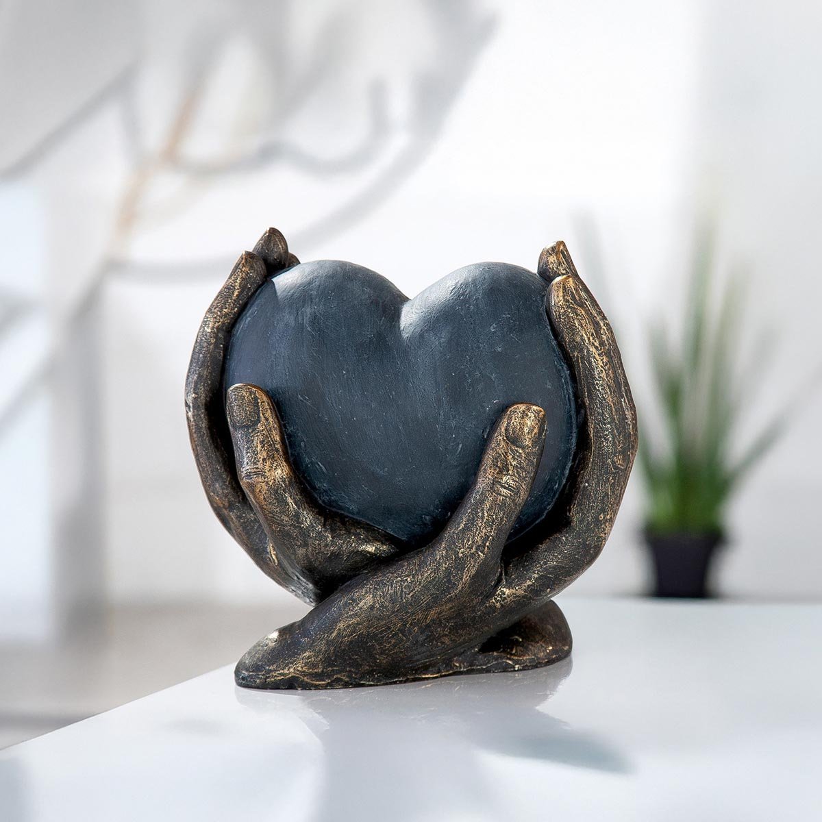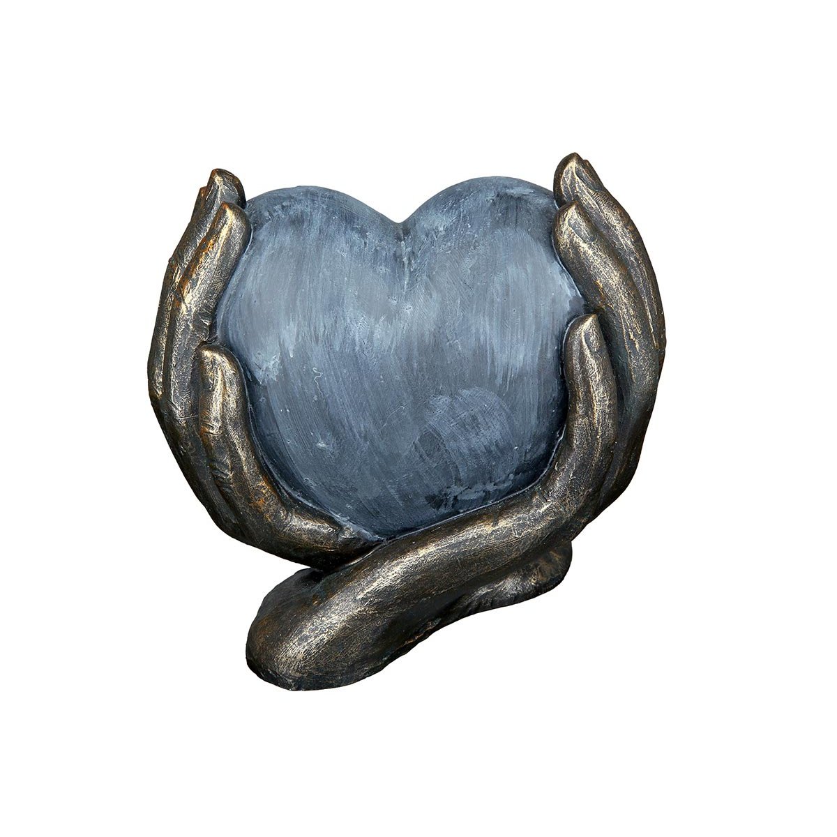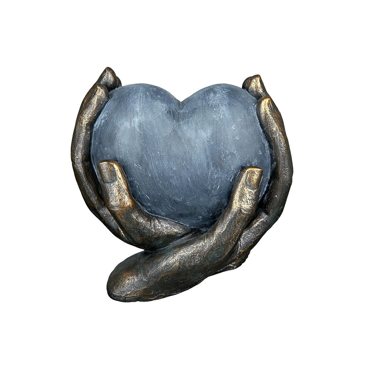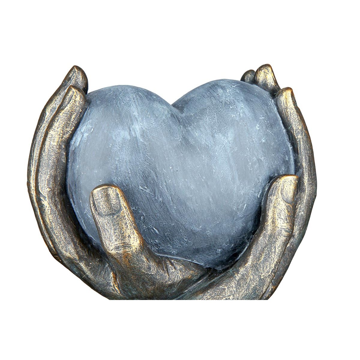 Výjimečná dekorativní soška zobrazuje srdce jemně sevřené v dlaních rukou a symbolizuje lásku, ochranu a blízkost. Kontrast šedého srdce a bronzově laděných rukou s antickým povrchem vytváří elegantní bronzovou sošku s nadčasovým vzhledem. Díky preciznímu zpracování se jedná o stylovou sošku do bytu, která vynikne na poličce, komodě i pracovním stole. Je vyrobena z kvalitního polyresinu a hodí se také jako originální dárek pro výjimečné příležitosti.