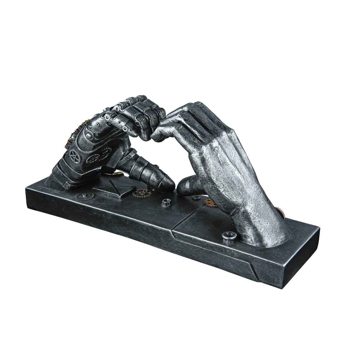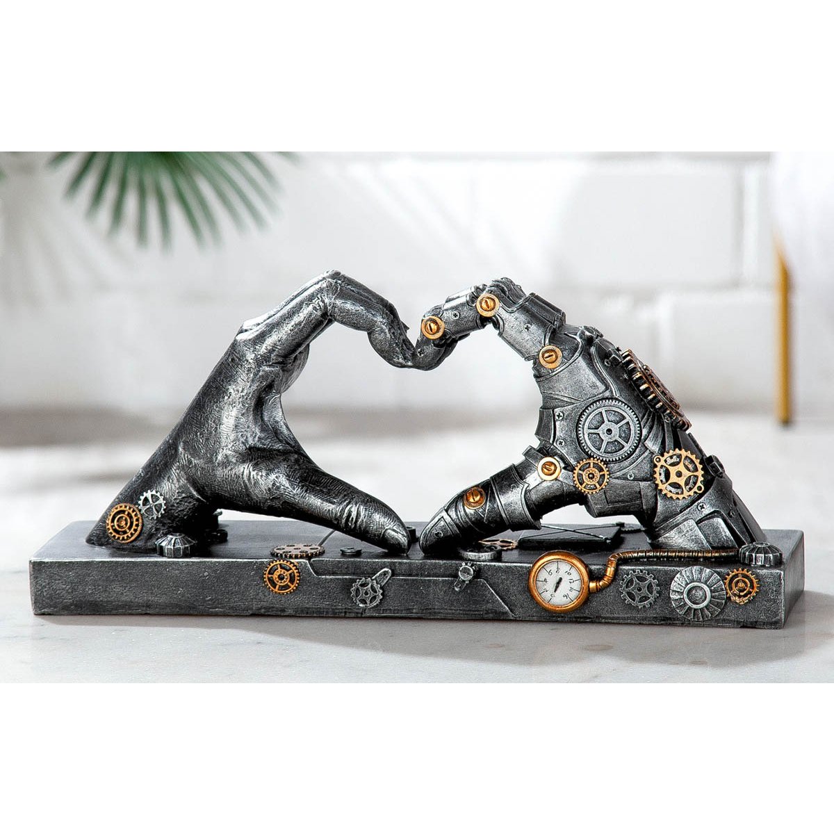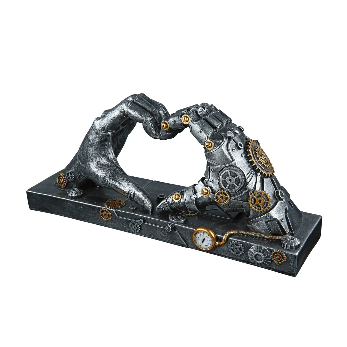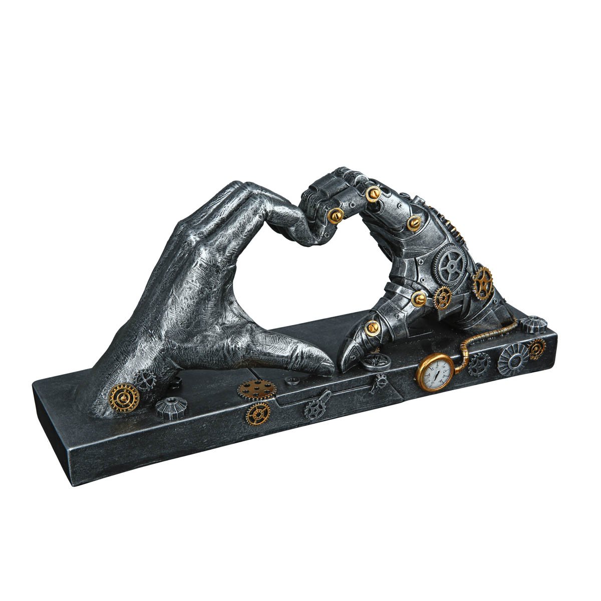 Máte rádi moderní dizajn? Chcete darovat dárek, který vaše pocity řekne za vás? Tato dekorace je pro vás to pravé. Vyjímat se bude v obývacím pokoji nebo pracovně. Obzvlášť vhodné jako dárek pro obdivovatele steampunku.Vyrobeno z polyresinu ve stříbrné barvě se starožitným vzhledem a zlatými akcenty.