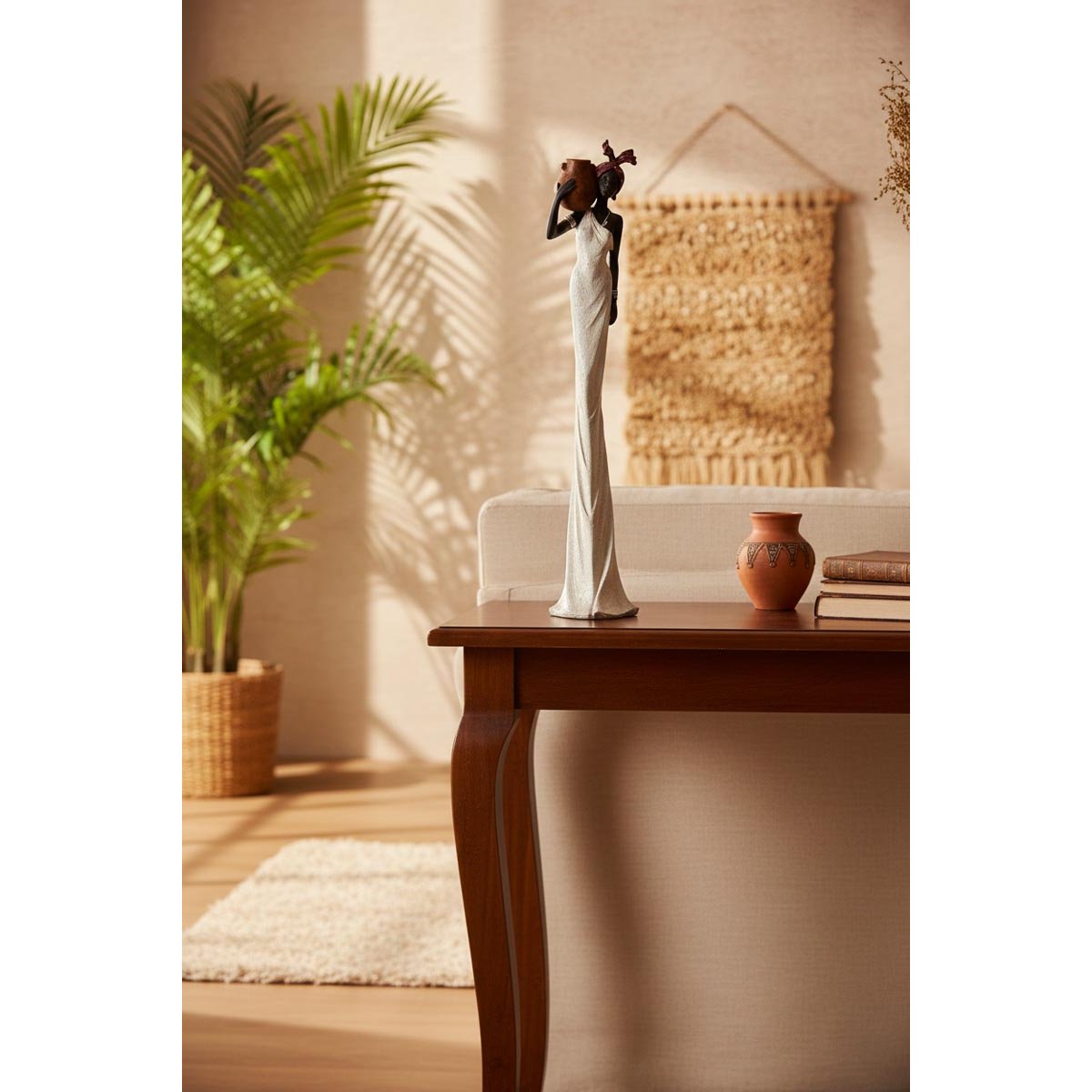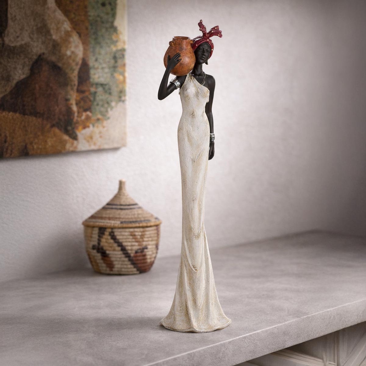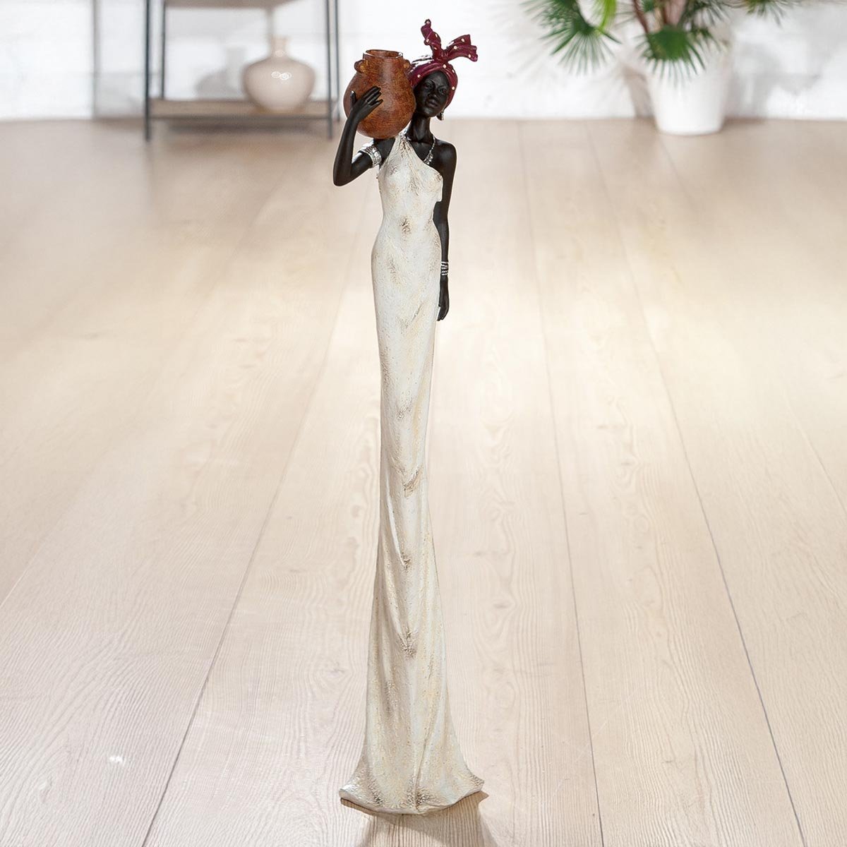 Krásná dekorativní soška v africkém stylu zaujme nejen svou výškou, ale i elegantním provedením. Štíhlá soška ženy s jemnými detaily působí velmi vkusně a stane se výrazným doplňkem interiéru. Skvěle zapadne jako etno dekorace do obývacího pokoje, pracovny i moderně laděného prostoru. Tato designová soška je také originálním dárkem k narozeninám, svátku nebo do nového bydlení. Barevné provedení kombinuje tmavé a světlé tóny, které snadno sladíte s ostatním vybavením.