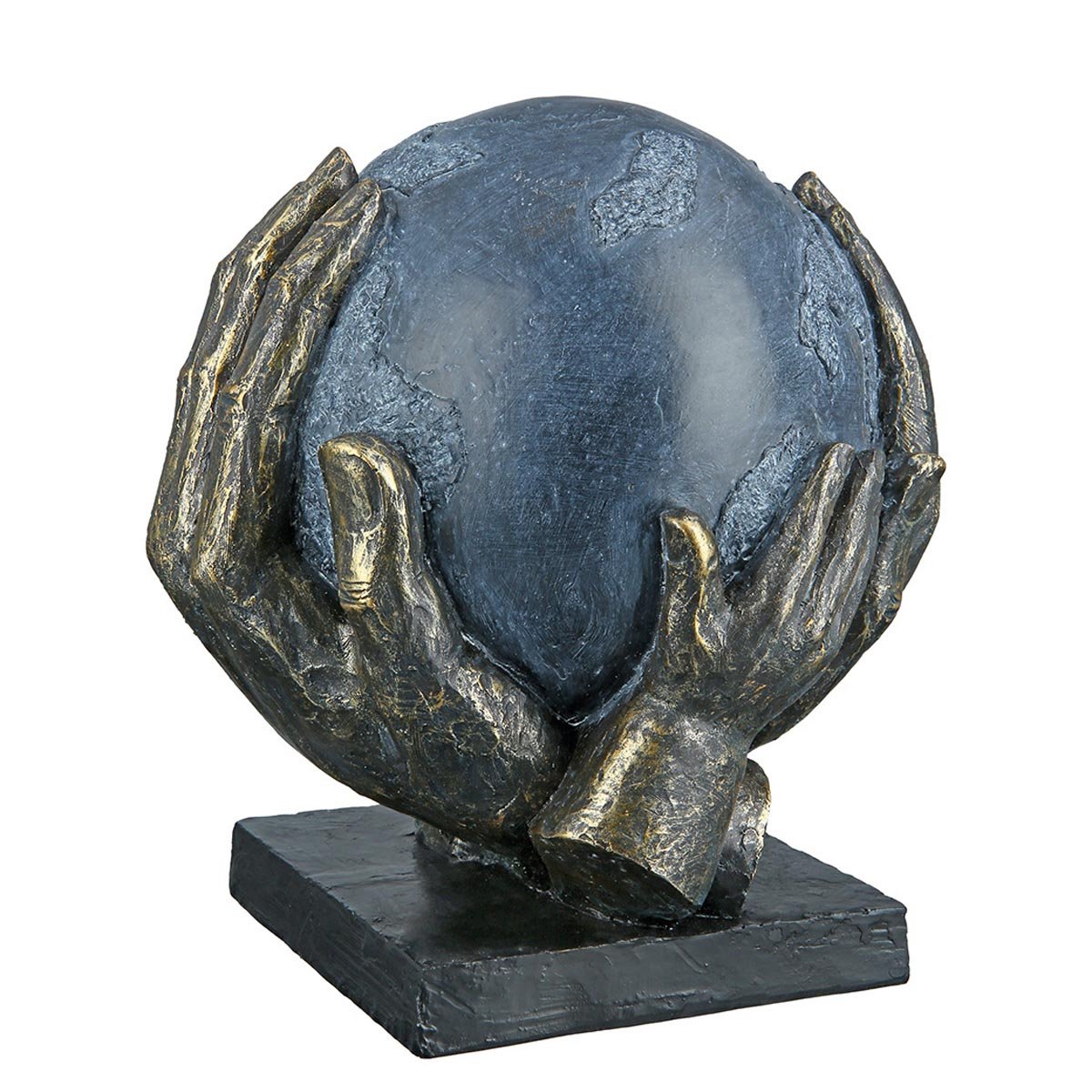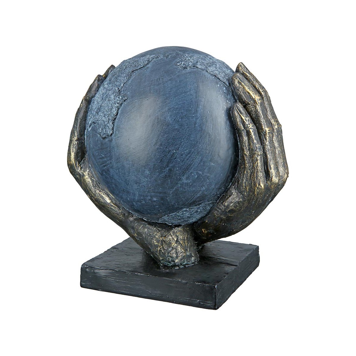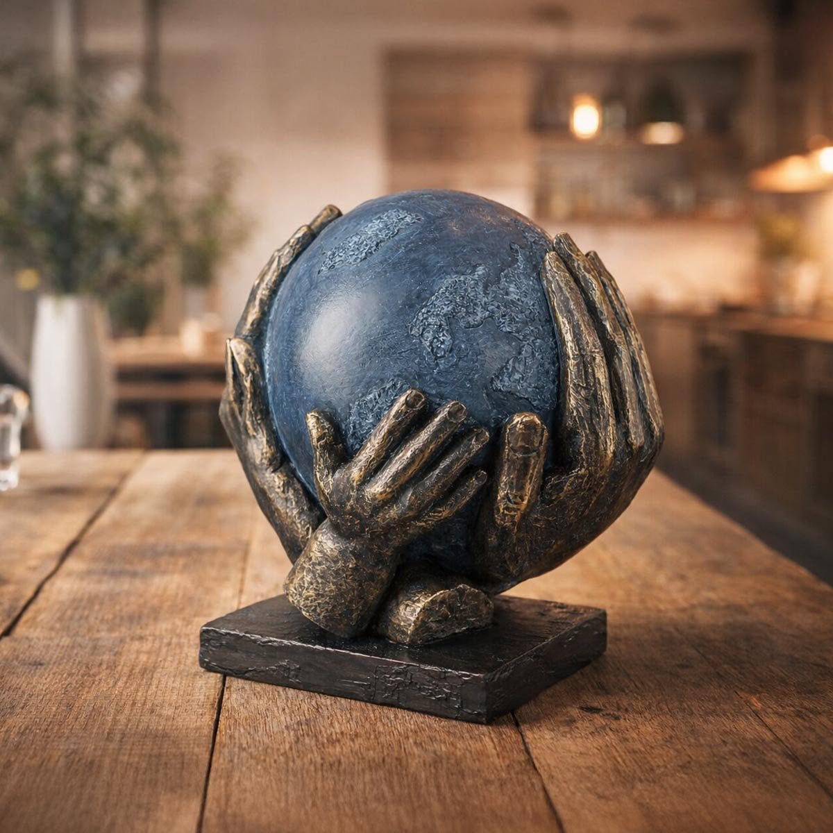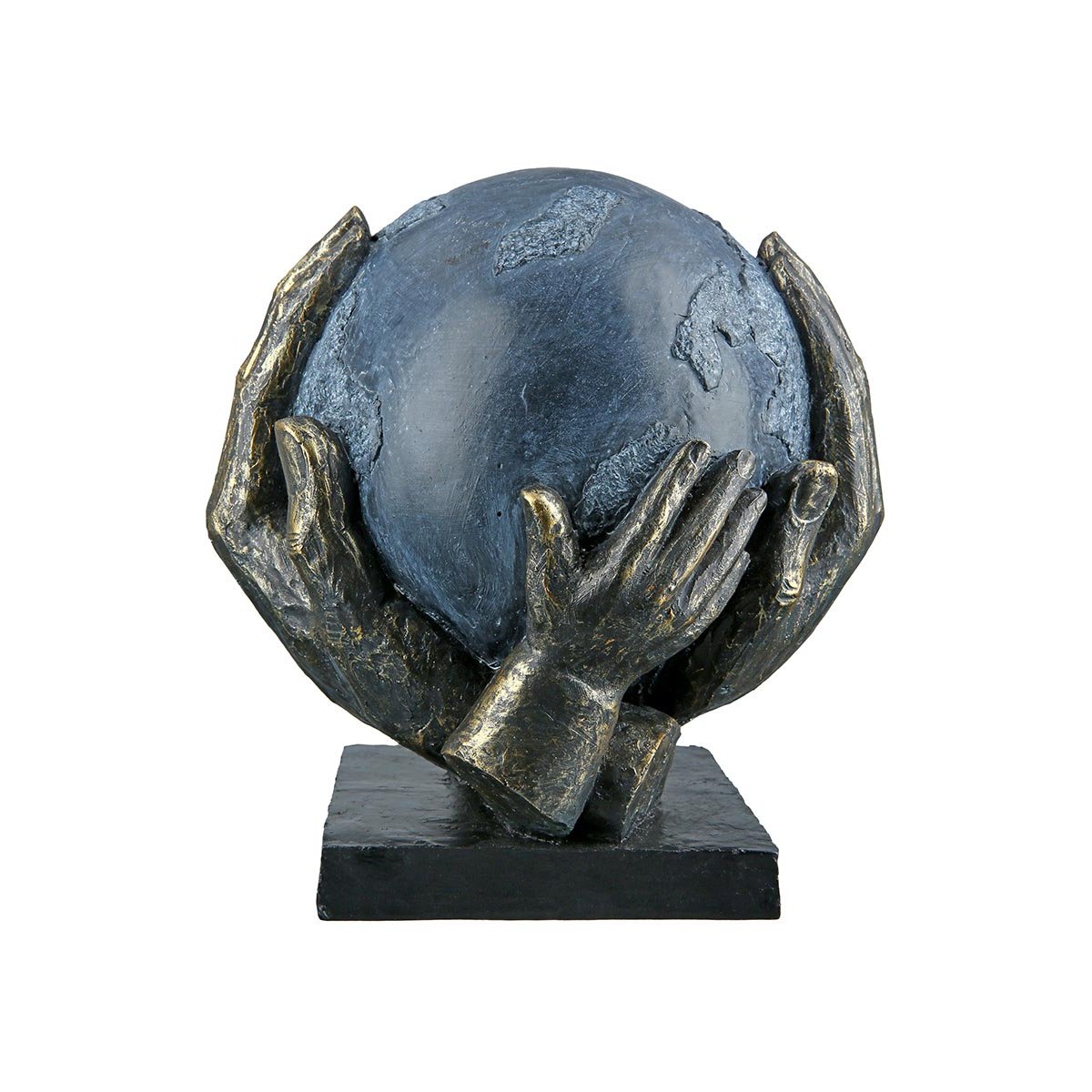Stylová dekorativní soška symbolizuje ochranu planety a odpovědnost za budoucnost světa. Motiv tří rukou držících zeměkouli působí moderně a elegantně. Bronzovo-šedé provedení v kombinaci s černým podstavcem vytváří výrazný designový prvek, který se skvěle hodí do obývacího pokoje, kanceláře, pracovny i reprezentativních prostor.