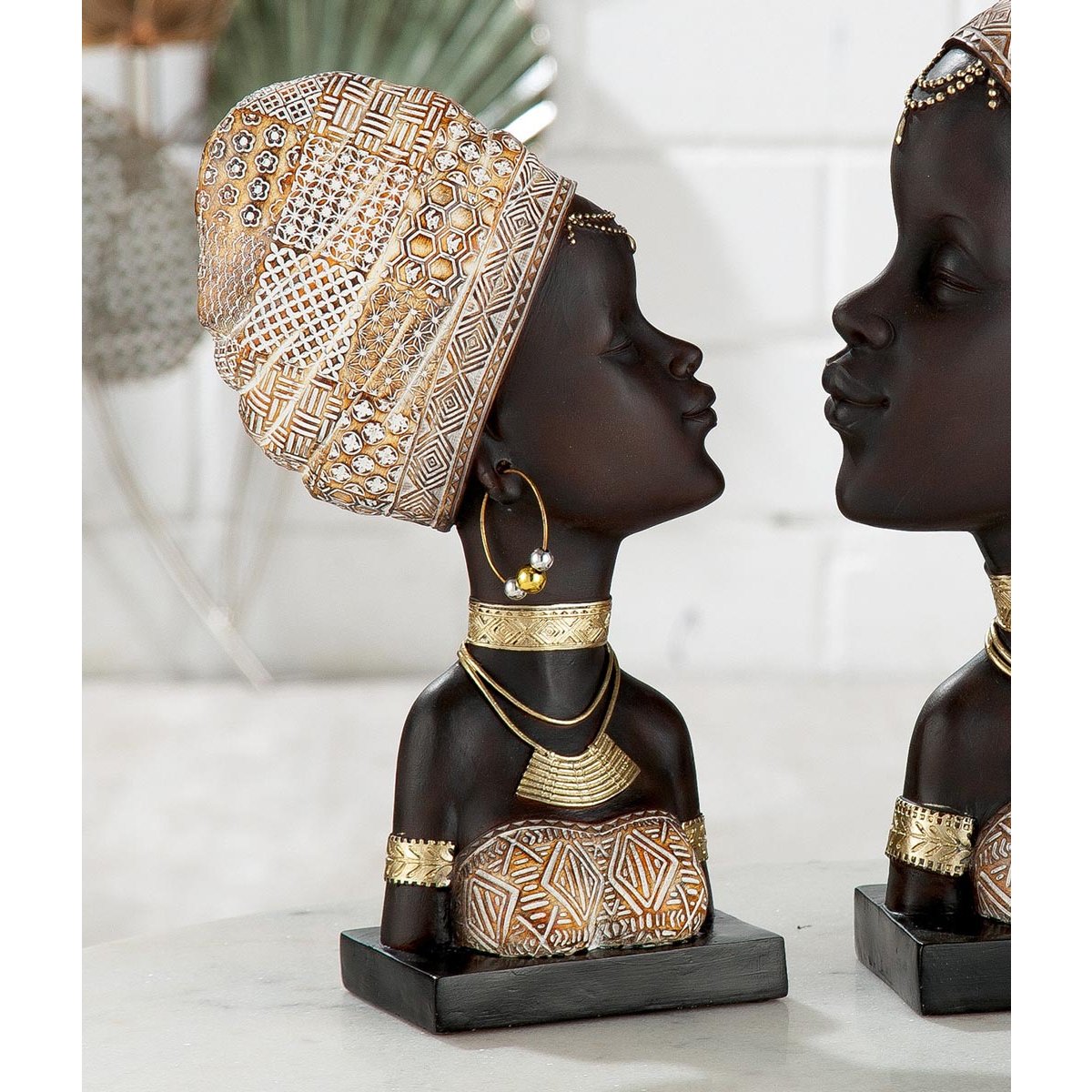Krásná africká soška ženy detailně zpracována se šátkem a šperky. Základní barvy jsou tmavě hnědá a zlatá. Busta je skvělou dekorací do obývacího pokoje, pracovny, ale hodí se i jako dárek k narozeninám, nebo do nového bydlení.