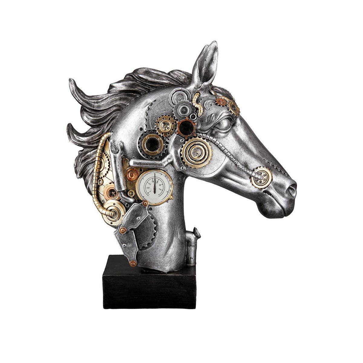 Tato moderní soška zobrazuje úchvatného koně ve stříbrné barvě se zlatými a měděnými prvky. Steampunk dekorativní sošky v duchu Julese Verna se vyjímájí v každém interiéru. Jsou ale i skvělým dárkem pro milovníky moderních dekorací, ať už k narozeninám nebo do nového bydlení.Doplňkové parametry