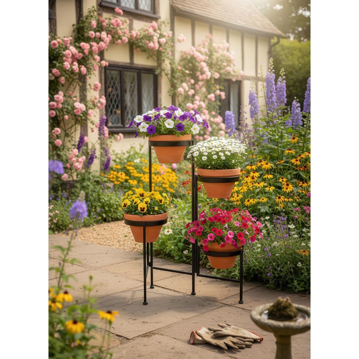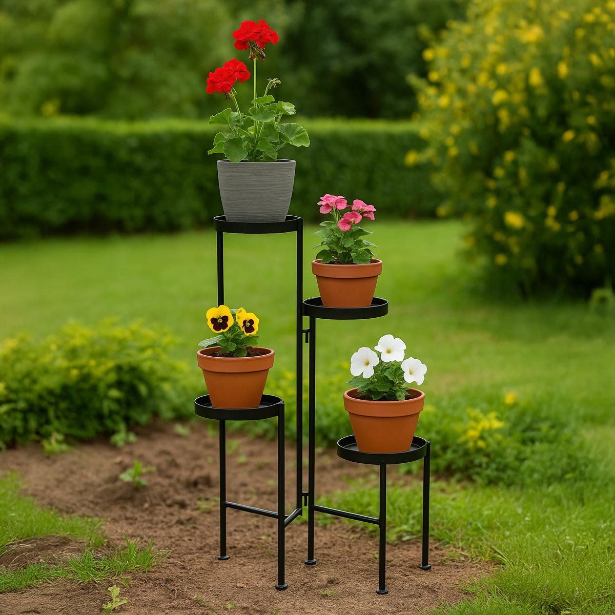 Elegantní kovový stojan na květináče v černé barvě je ideálním doplňkem pro zahradu, terasu nebo vstupní prostor. Víceúrovňová konstrukce umožňuje vystavení několika květináčů najednou a vytváří dekorativní, přehledné uspořádání rostlin. Stabilní kovová konstrukce zajišťuje pevnost a dlouhou životnost, zatímco nadčasový design květinového stojanu se snadno kombinuje s různými styly exteriéru.