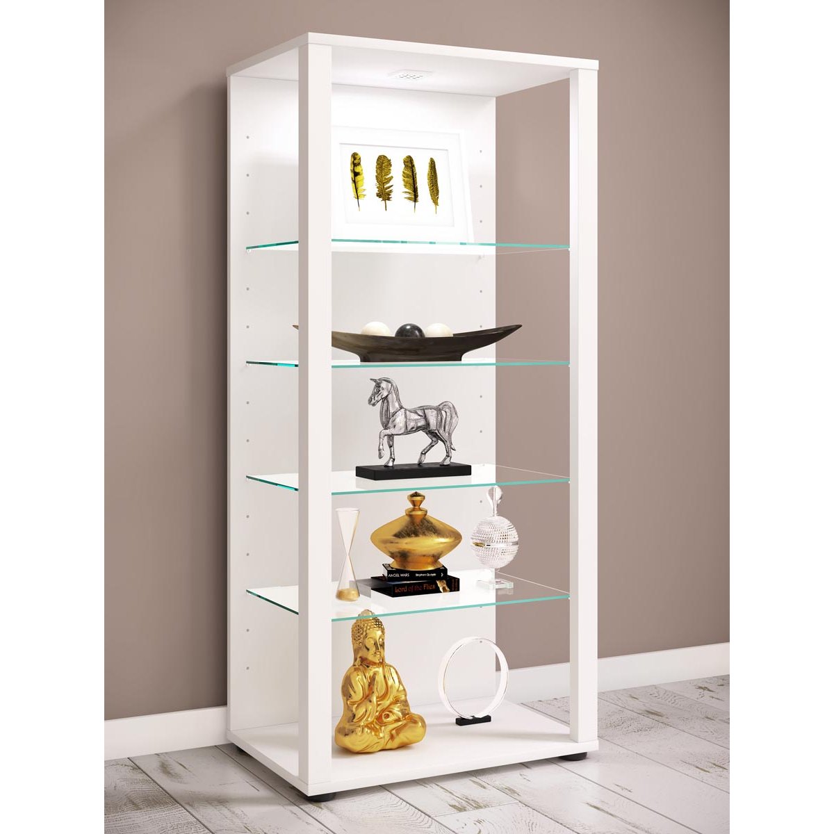 Čtyři variabilní police z bezpečnostního skla ESG poskytují dostatek prostoru pro dekorace, modely i sběratelské kousky. Vitrína je ideální jako sběratelská vitrína i jako vitrína na modely, kde umožní přehlednou prezentaci vystavených exponátů. Díky svému štíhlému provedení funguje také jako vysoká vitrína, která efektivně využívá prostor v místnosti.