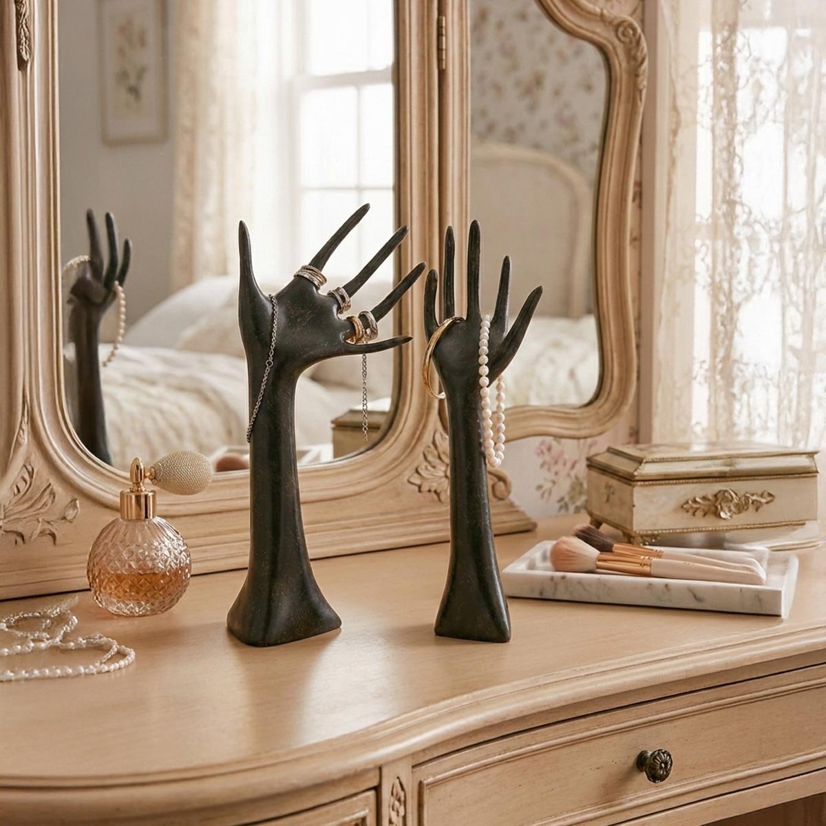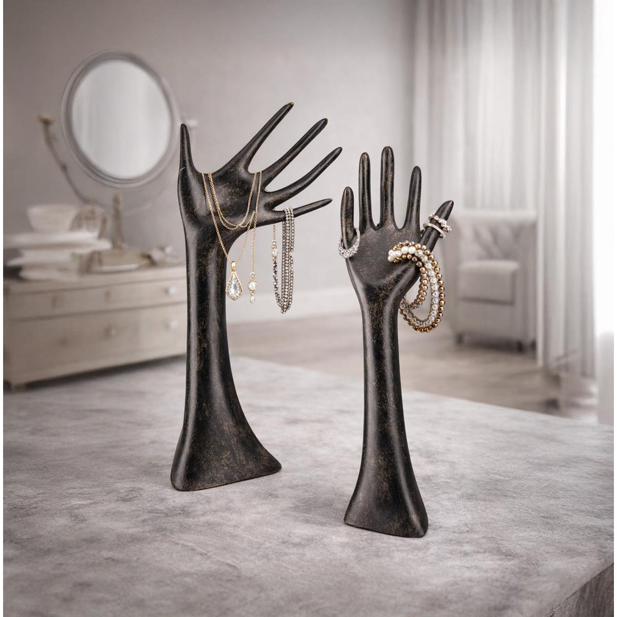 Stylová sada dvou stojanů na šperky je originální dekorativní soškou i praktickým řešením pro přehledné uložení šperků. Unikátní tvar rukou působí jako moderní designová dekorace a zároveň umožňuje elegantně vystavit prsteny, náramky, náhrdelníky i hodinky.