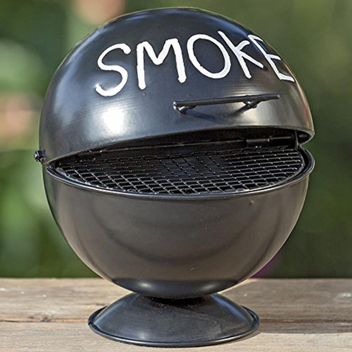 Stolní popelník s nápisem Smoke. Svým provedením v lakovaném kovu připomíná venkovní gril. Je určen zejména k venkovnímu použití, nenahraditelný během odpočinku na terase či zahradě.