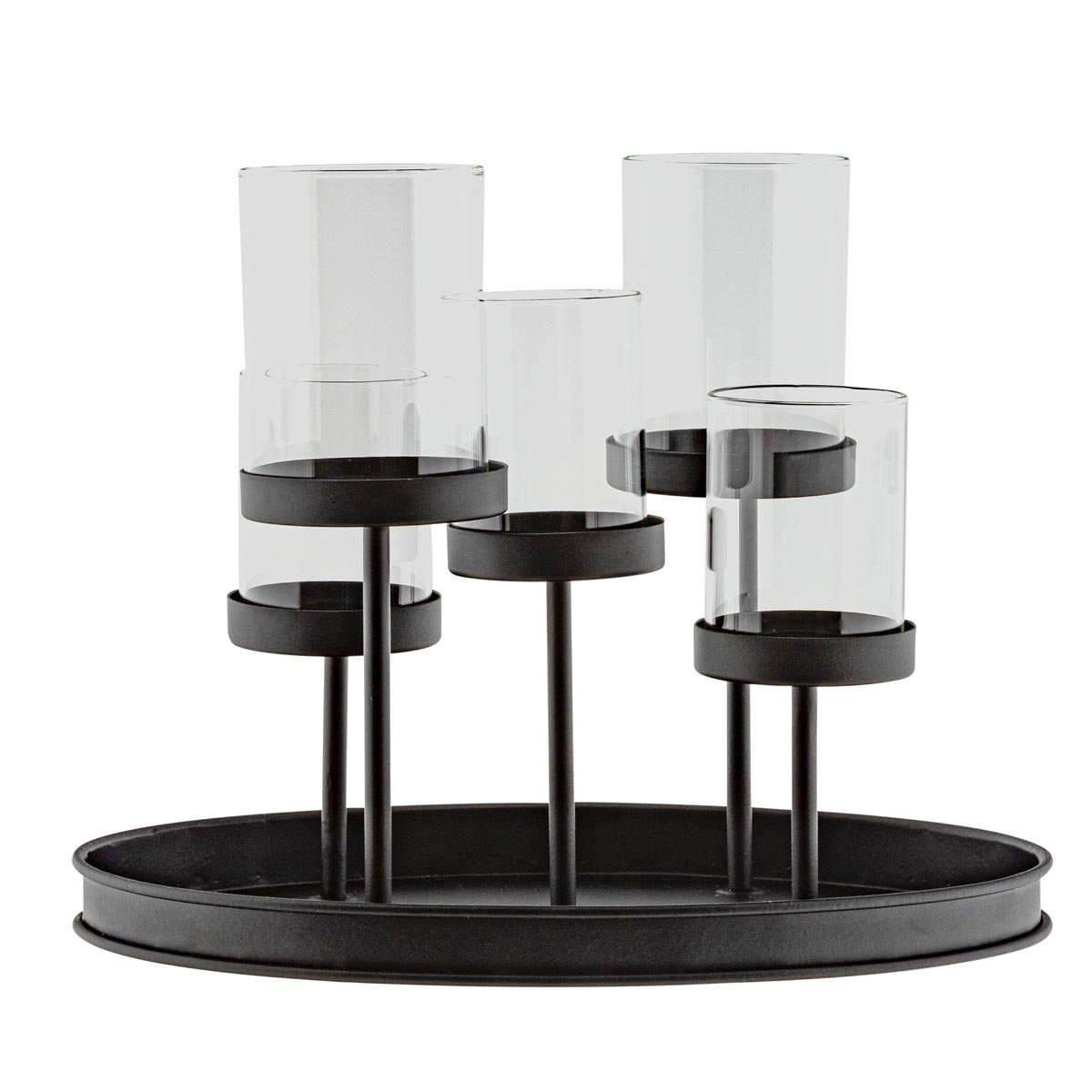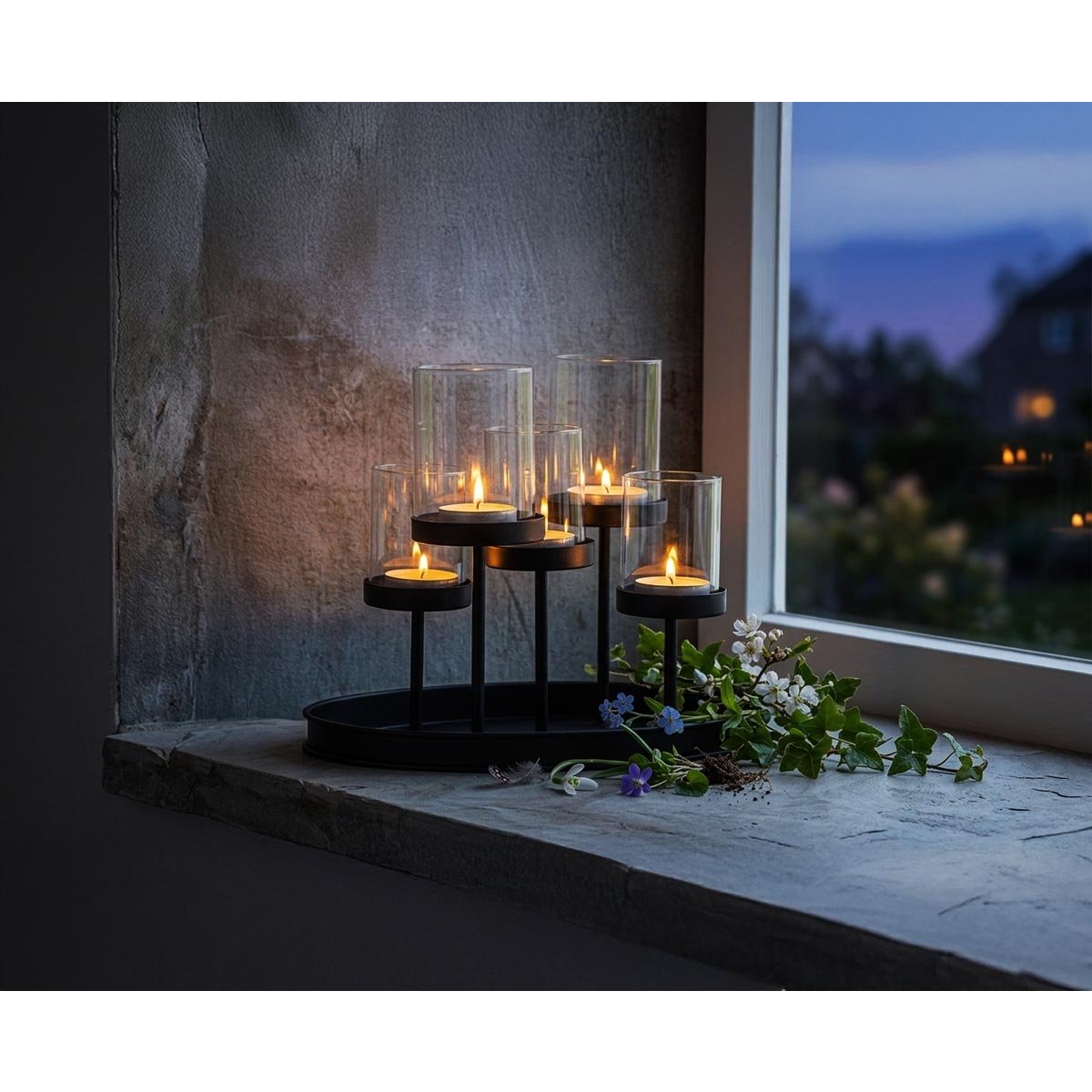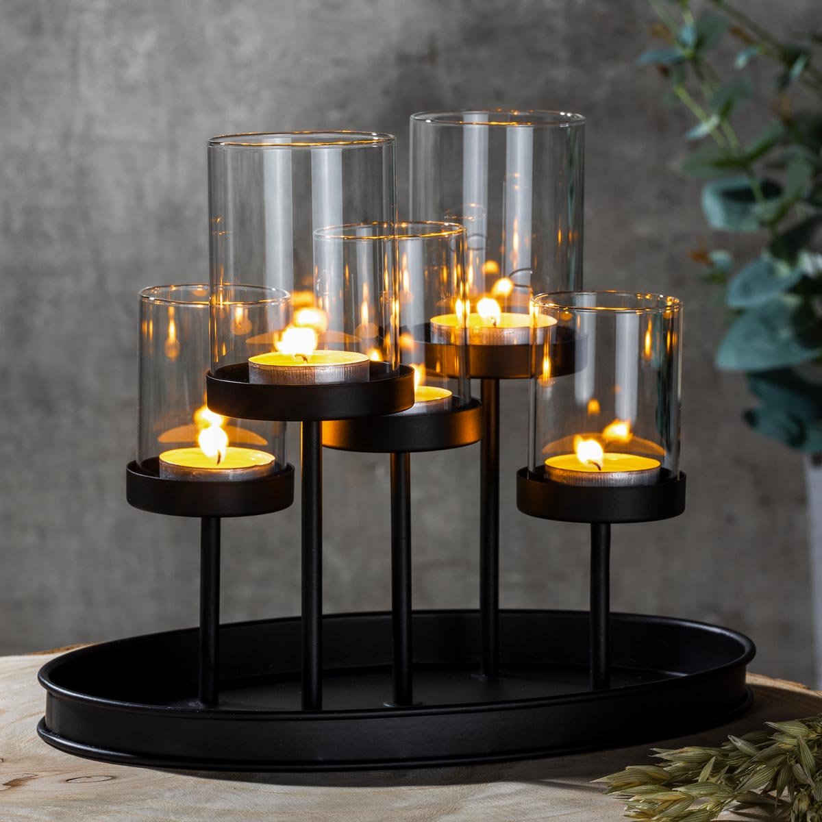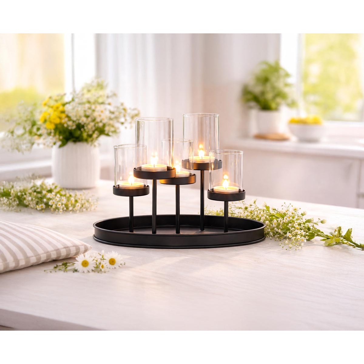 Tento stylový svícen kombinuje moderní černý kovový rám s pěti skleněnými držáky, které umožňují snadné umístění čajových svíček. Díky svému elegantnímu vzhledu se hodí do různých interiérů a je ideální pro použití na jídelním stole, komodě nebo jako dekorace na sváteční stůl.