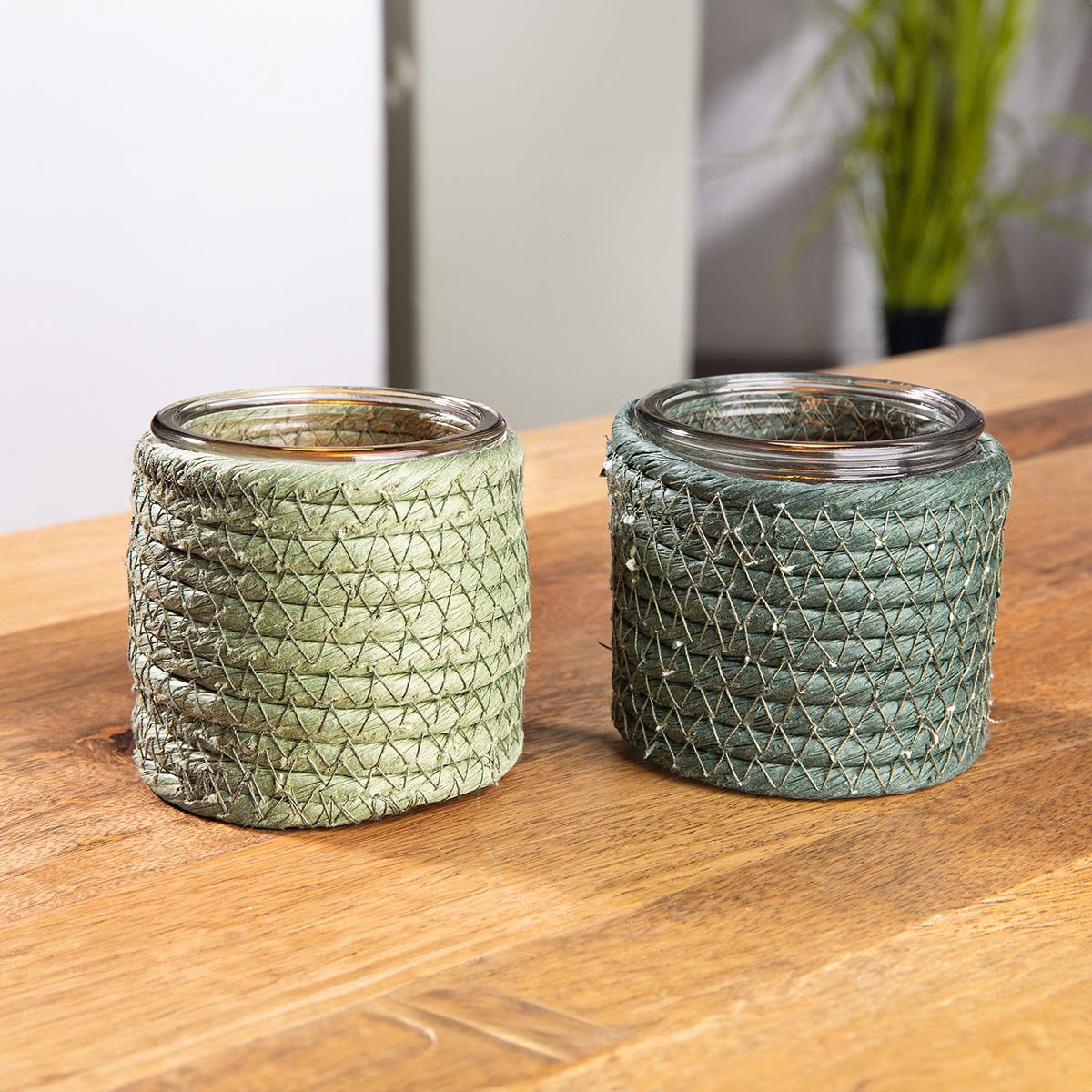 Skvělý nápad! Dvojici skleněných svícnů obepínají pečlivě protkané zelené papírové provázky a výsledek je velmi efektní. Postavte je na stůl, poličku, parapet; krásně ozáří prostor na chodbě atd. Užijte si decentní osvětlení, které dokáží vykouzlit.