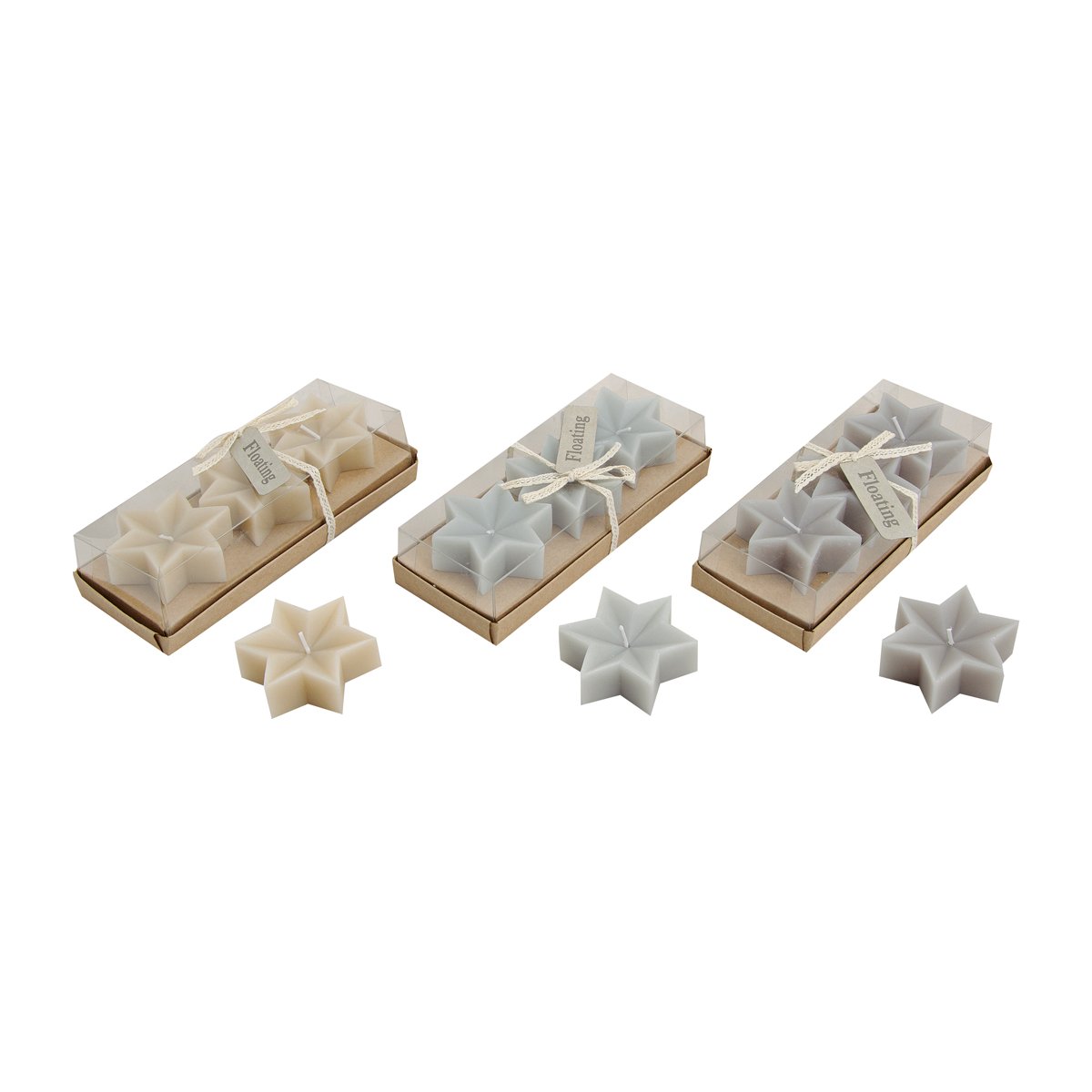 Dekorační svíčky ve tvaru hvězdy v jemných přírodních odstínech. Sada je navíc zabalena v dárkové krabičce.