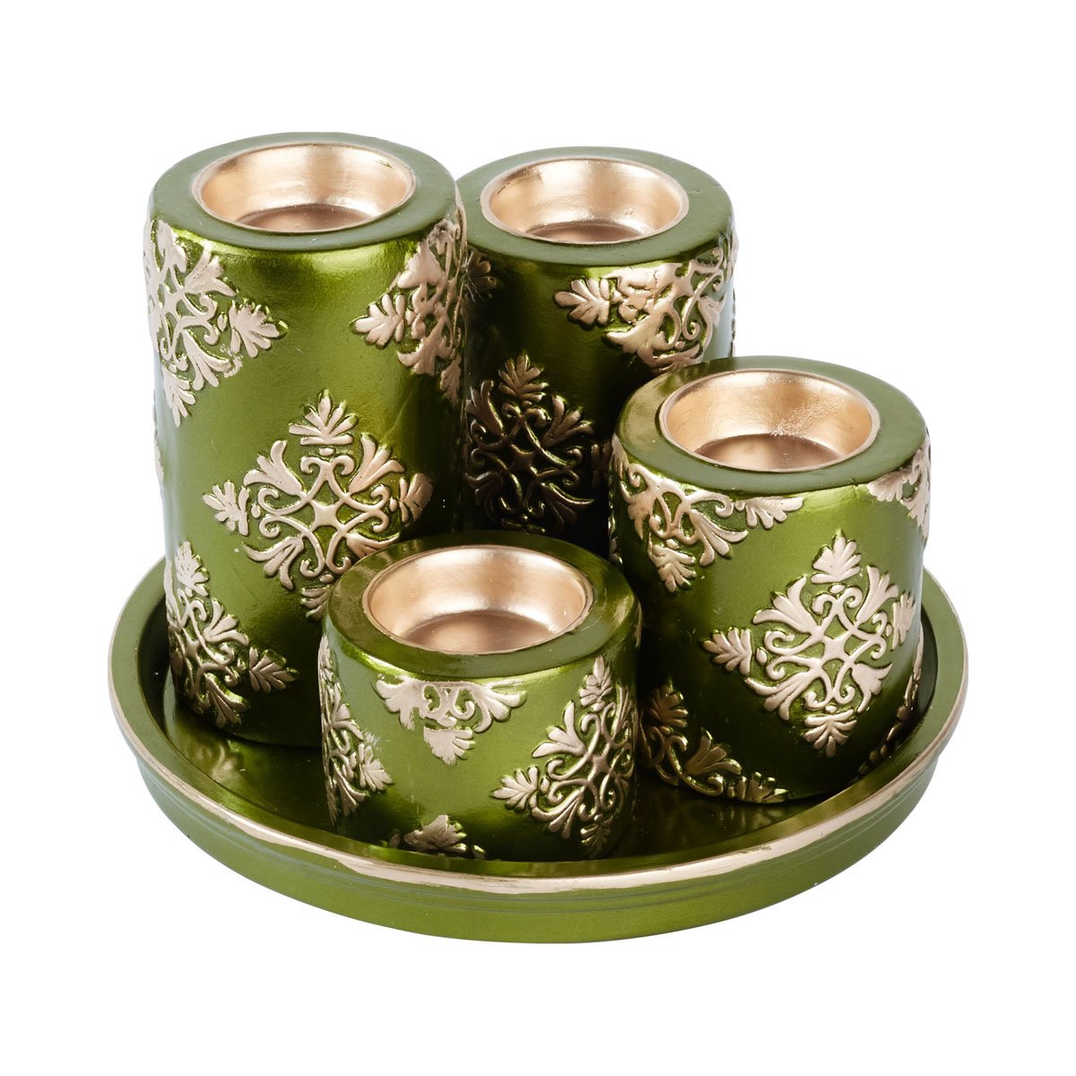 Rozměry: talíř Ø 22 cm, Ø svícnů 7,5 cm a výška svícnů 6, 9, 11 a 14 cm.