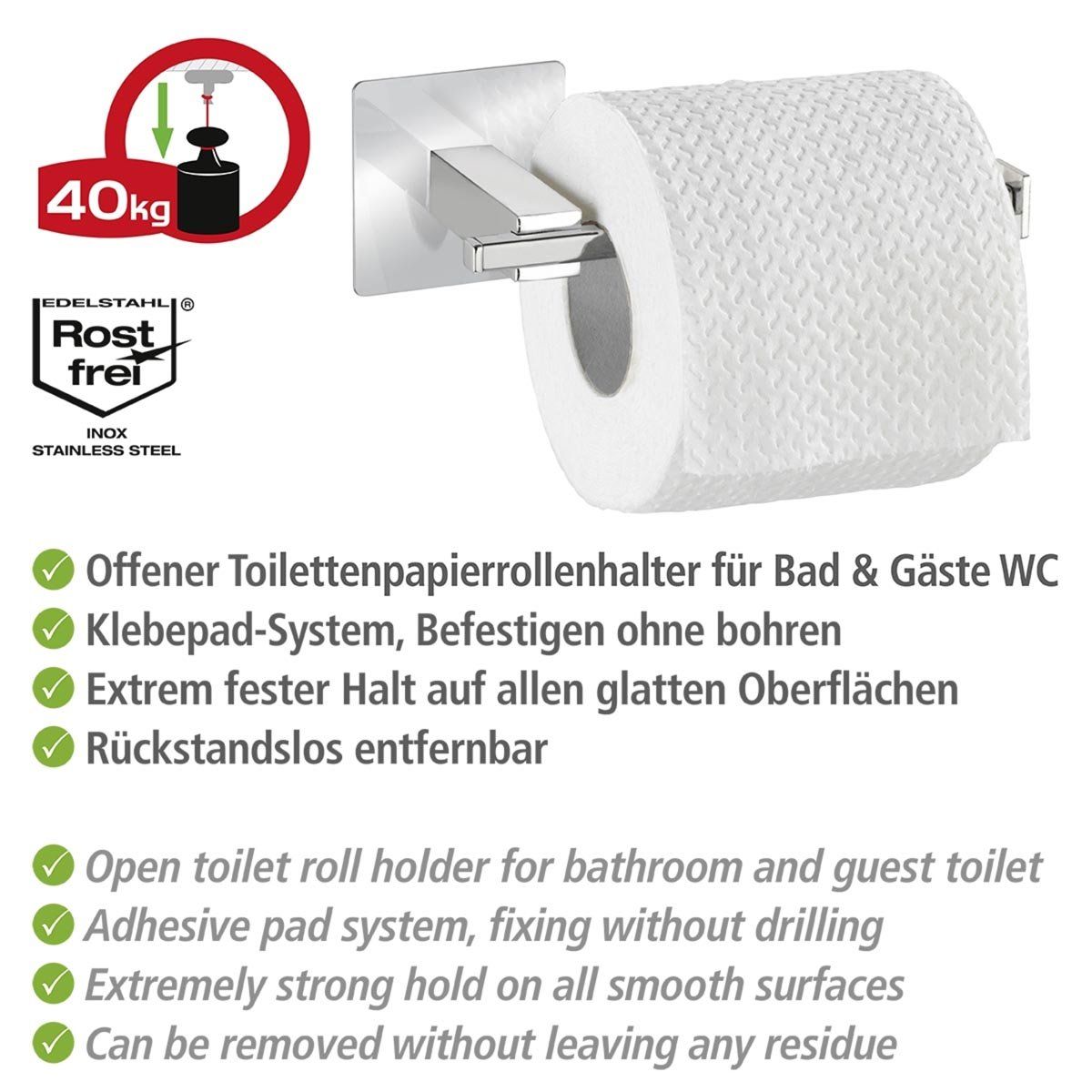 Díky kvalitní nerezové oceli je držák odolný vůči vlhkosti, korozi i běžnému opotřebení. Kompaktní rozměry umožňují použití i v menších prostorách. Praktická montáž bez vrtání zajišťuje rychlé a pohodlné upevnění bez poškození obkladů.
