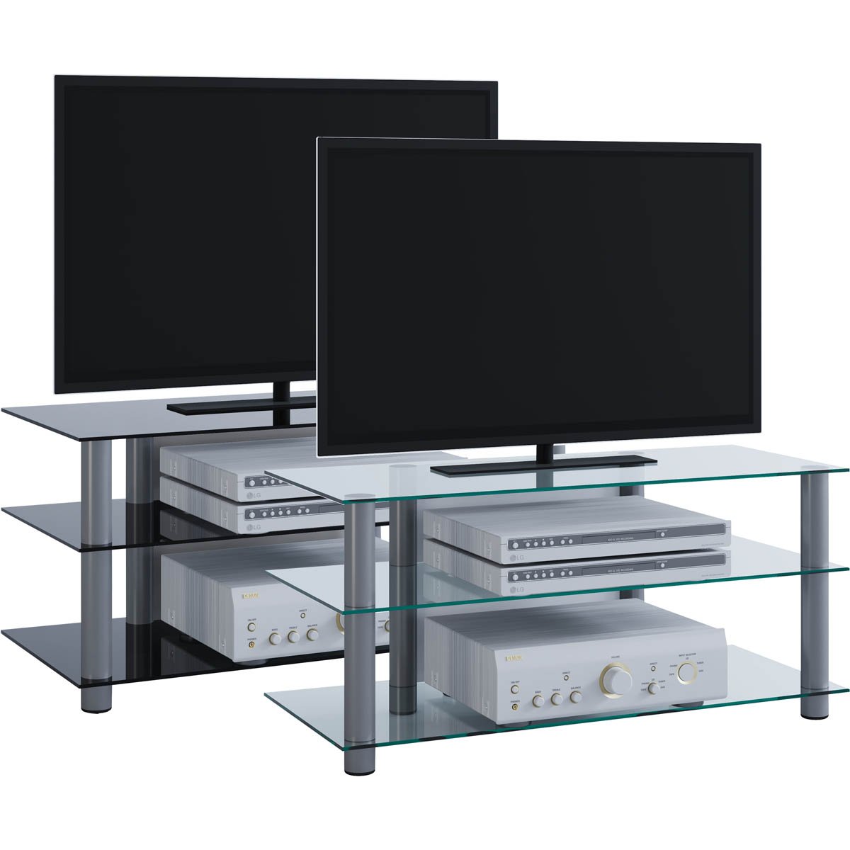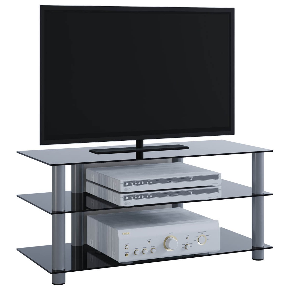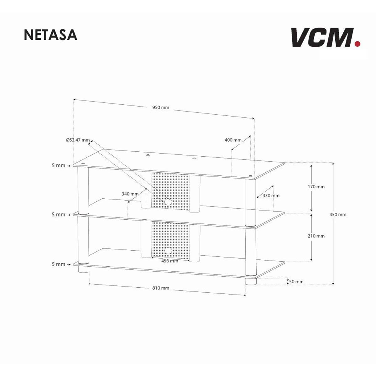 Tento moderní televizní stolek se skládá ze 3 stabilních polic z tvrzeného bezpečnostního skla a trubek z vysoce kvalitního hliníku.