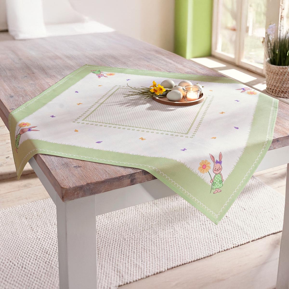 Roztomilý velikonoční ubrus přináší veselé akcenty. Roztomilý zajíček s květinou láká motýly a chrání stůl před drobečky, skvrnami i poškrábáním.
