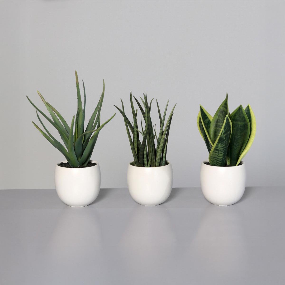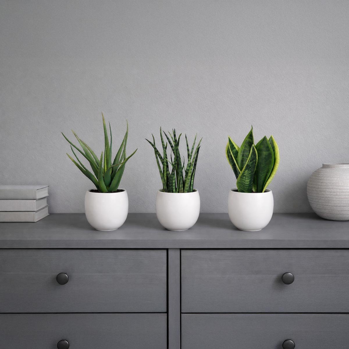 Rostliny jsou zasazeny v jednoduchých bílých květináčích, které se hodí do moderního i minimalistického interiéru. Skvěle se vyjímají na polici, komodě, pracovním stole nebo parapetu.