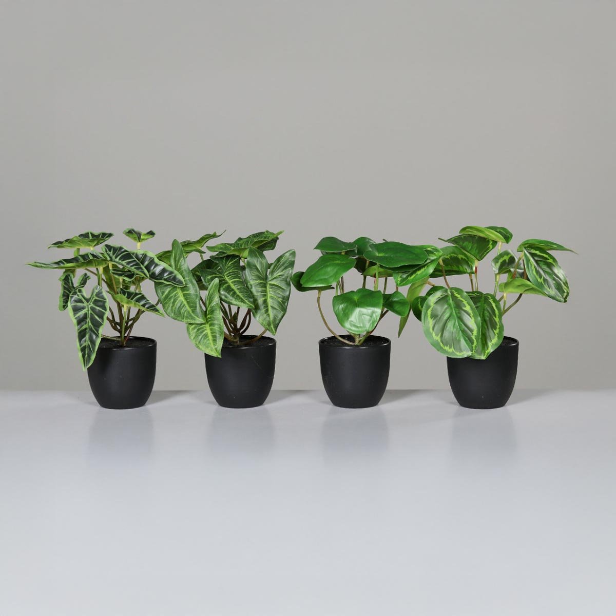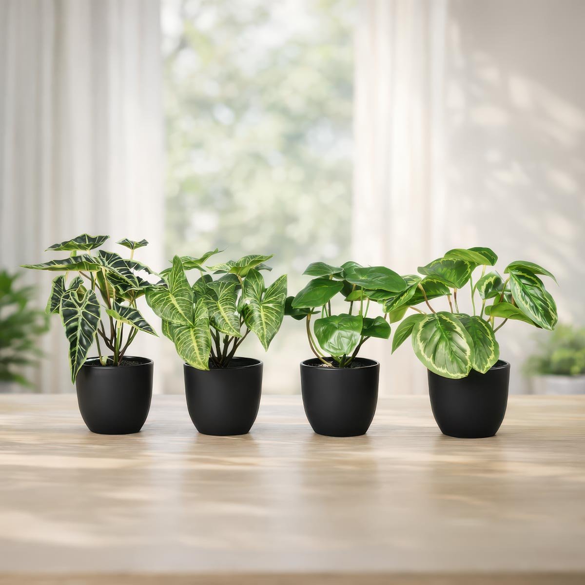 Sada čtyř dekorativních pokojových rostlin vnese do interiéru svěží zelený akcent bez nutnosti péče. Každá rostlina má odlišný tvar listů, takže společně vytvářejí přirozeně působící a zajímavou dekoraci do obývacího pokoje, ložnice nebo kanceláře.