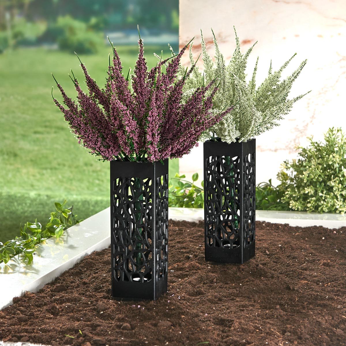 Dopřejte hrobu své milované osoby důstojné a stylové dekorování s touto elegantní vázou s prolamovaným vzorem. Zdobená umělými květinami se stane jemným trvalým vyjádřením vaší náklonnosti.