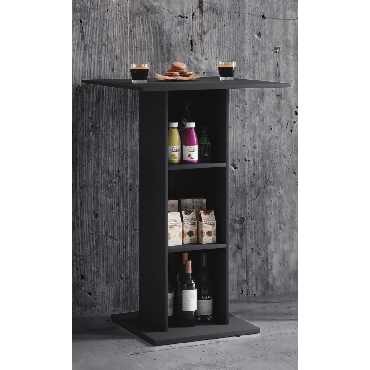 Barový stůl Standos je moderní a funkční kus nábytku, který lze využít nejen jako barový stůl, ale také jako odkládací stolek nebo praktický nábytek do kuchyně. Díky třem policím nabízí dostatek prostoru pro uložení nápojů, kuchyňských doplňků nebo dekorací.