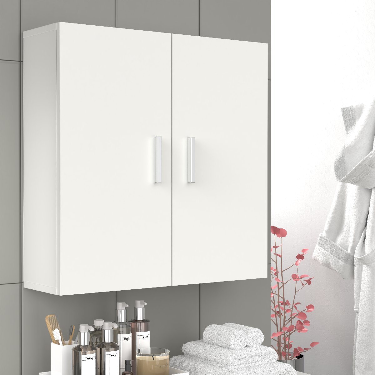 Tato elegantní bílá skříňka nabízí dostatek úložného prostoru pro kosmetiku, holicí strojky, náhradní hlavice i nabíječky. Díky praktickému vnitřnímu uspořádání pomáhá udržet koupelnu přehlednou a uklizenou.