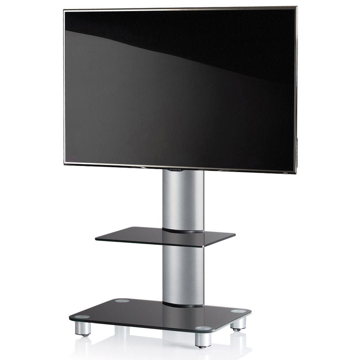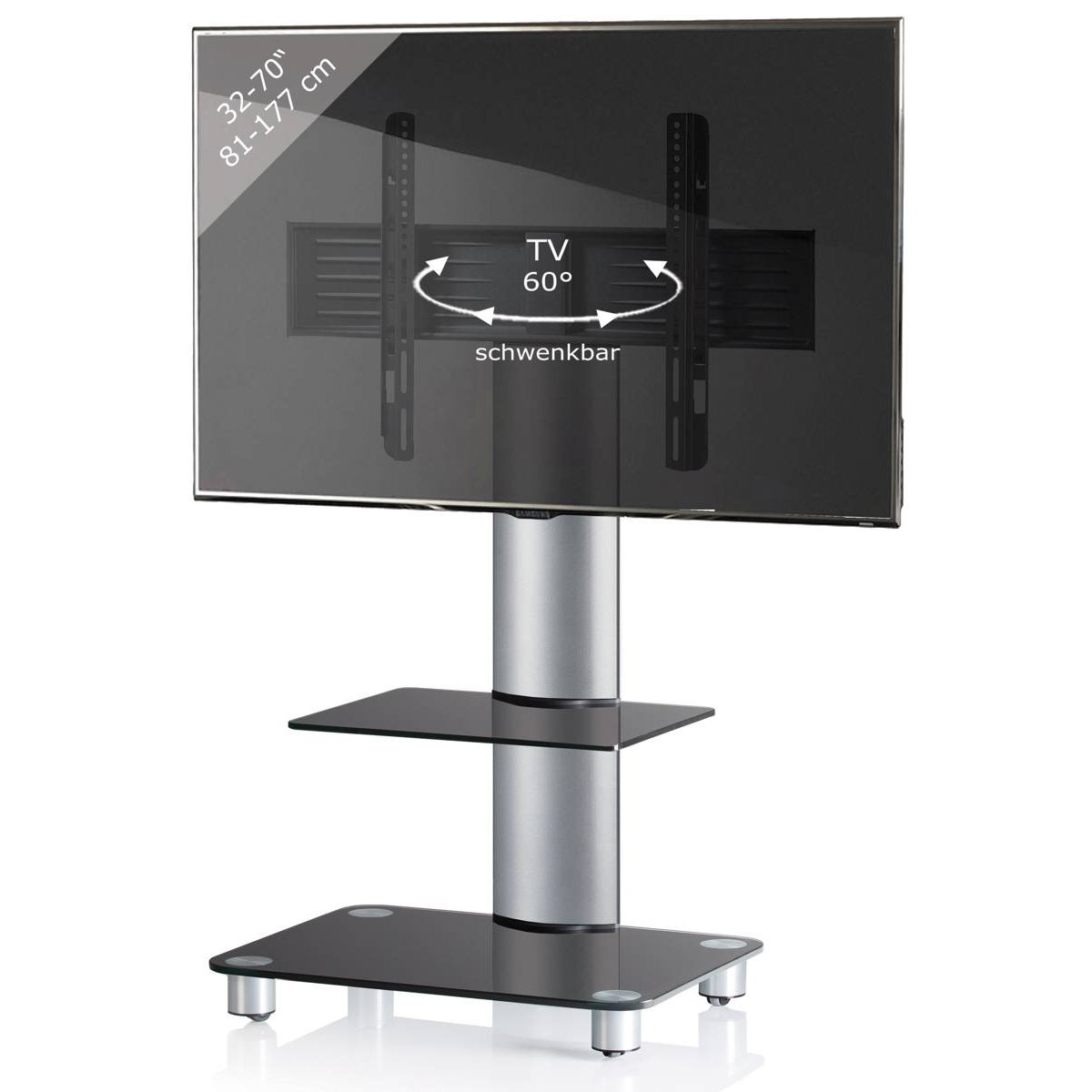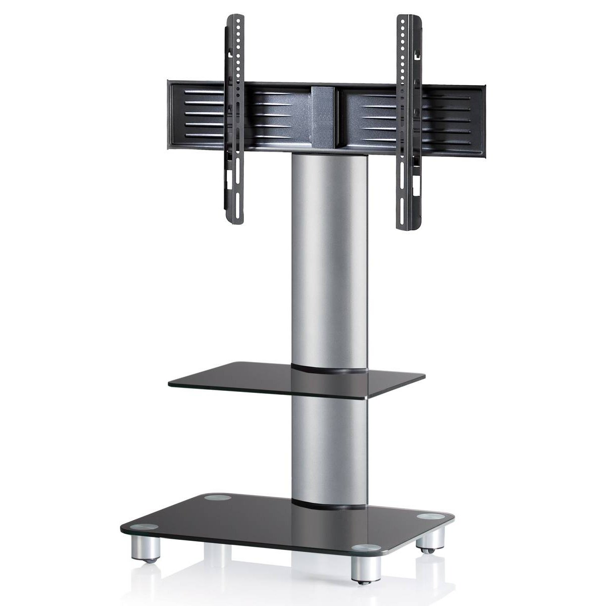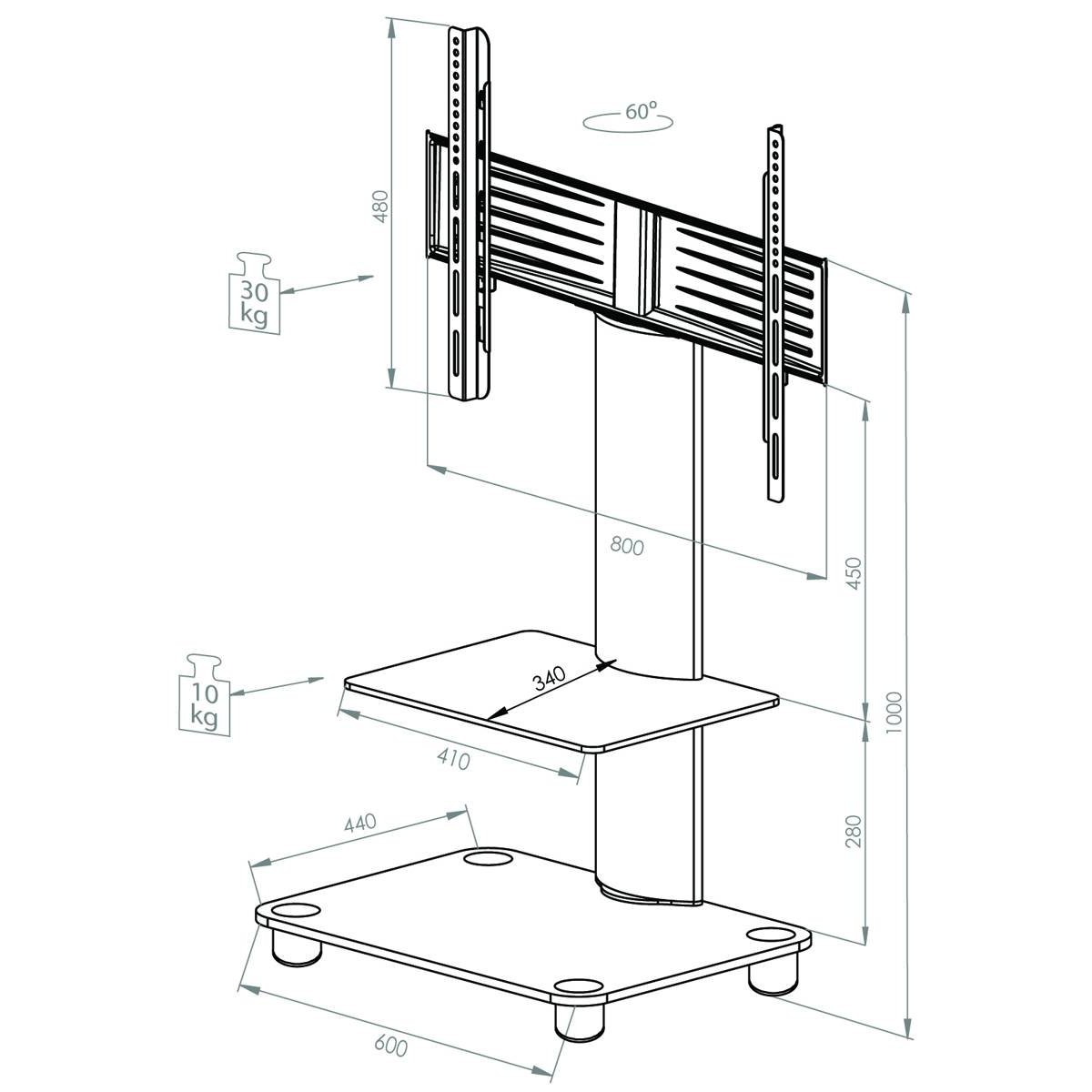 TV stolek VCM „Tosal“ se skleněnou policí. - Hliníková trubka, stříbrně kartáčovaná. - Včetně držáku pro většinu plochých LED / LCD / plazmových obrazovek do úhlopříčky 37 palců (94 cm) s max. hmotností 30 kg. - Funkce otáčení: rozsah otáčení 60°. - VESA 200x100, 200x200, 300x200, 300x300, 400x200, 400x300, 400x400, 600x100, 600x200, 600x300 a 600x400 mm. - Skleněné police vyrobené z bezpečnostního skla vyztuženého ESG. - Skleněná podlaha 10 mm. - Police: Tloušťka: 8 mm, max. nosnost: 10 kg, rozměry skleněné police: Š. 41 x H. 34 cm. - Kabelový kanál na zadní straně hliníkové trubky. - Včetně sady rolí s hladkým chodem. - Dodáváno v demontovaném stavu včetně montážního návodu a montážního materiálu. - Rozměry výrobku: V 100 x Š 60 x H 44 cm.Buďte první, kdo napíše příspěvek k této položce.