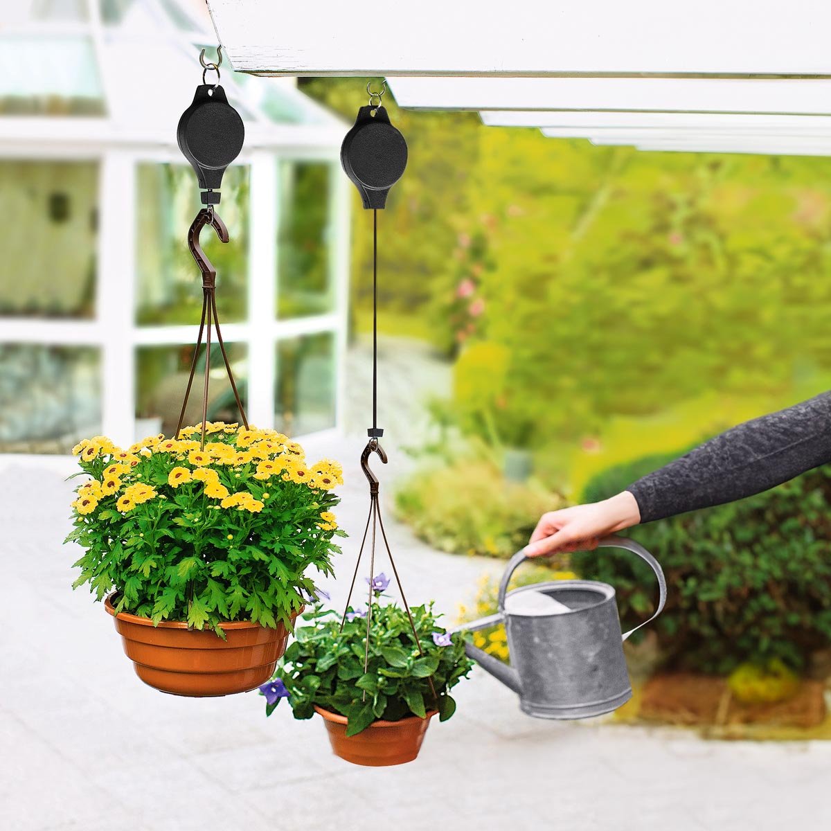 Už žádné složité zalévání nad hlavou. Tato výsuvná kladka funguje jako praktický držák na závěsné květináče, který umožňuje jejich snadné spuštění i vytažení.