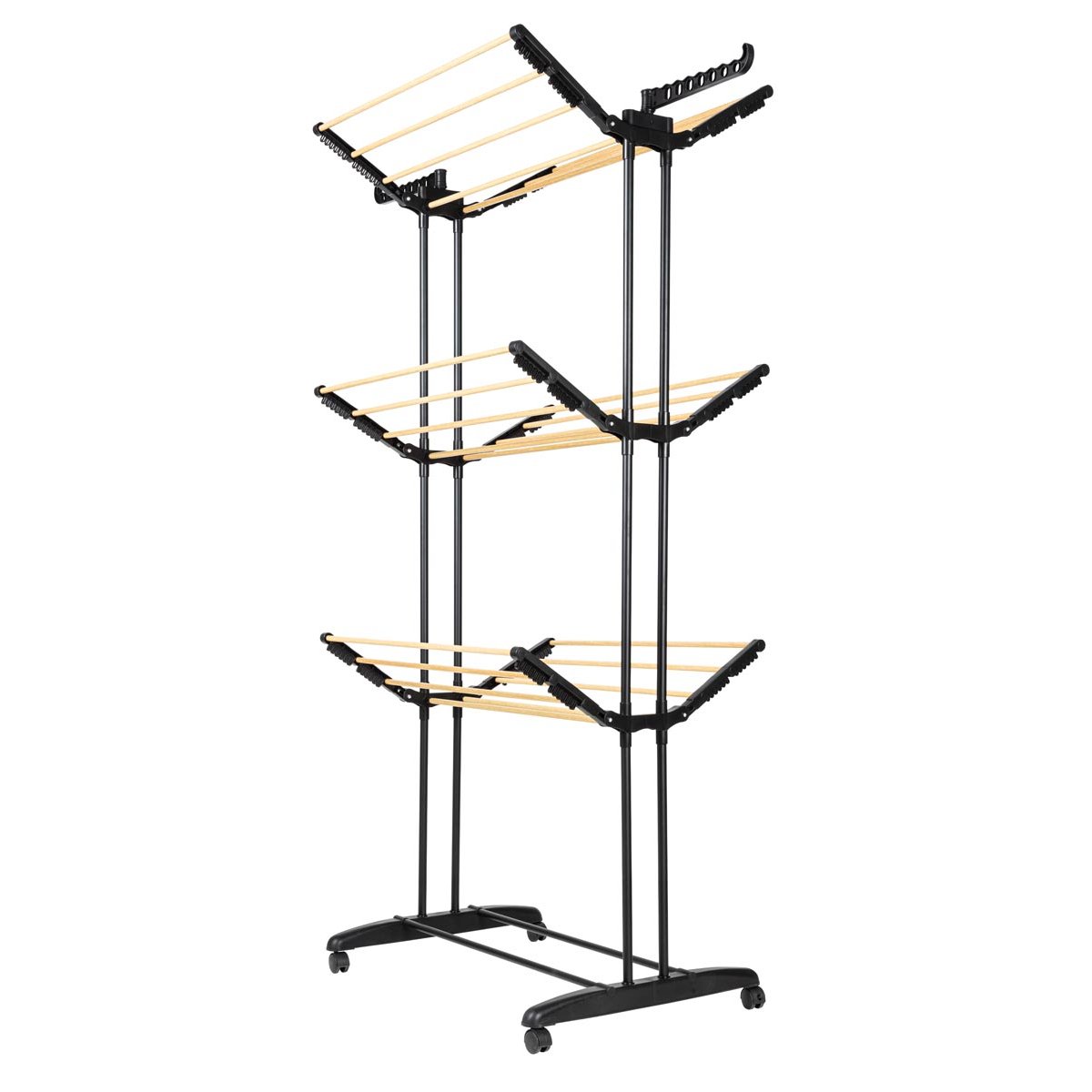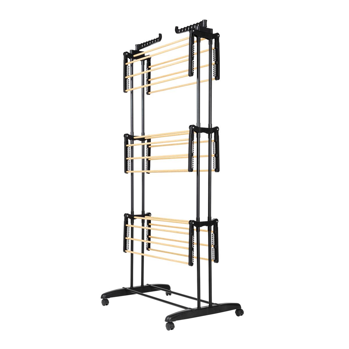 Praktický sušák na prádlo do výšky je ideálním řešením pro efektivní sušení prádla i v menších prostorách. Tři rozkládací úrovně a dva boční držáky až pro 14 ramínek poskytují dostatek místa pro přehledné zavěšení prádla. Díky otočným kolečkům o 360° s brzdou lze sušák snadno přesouvat i plně naložený. Po použití jej jednoduše složíte a uložíte. Skvěle se hodí do bytu, koupelny i sprchového koutu.